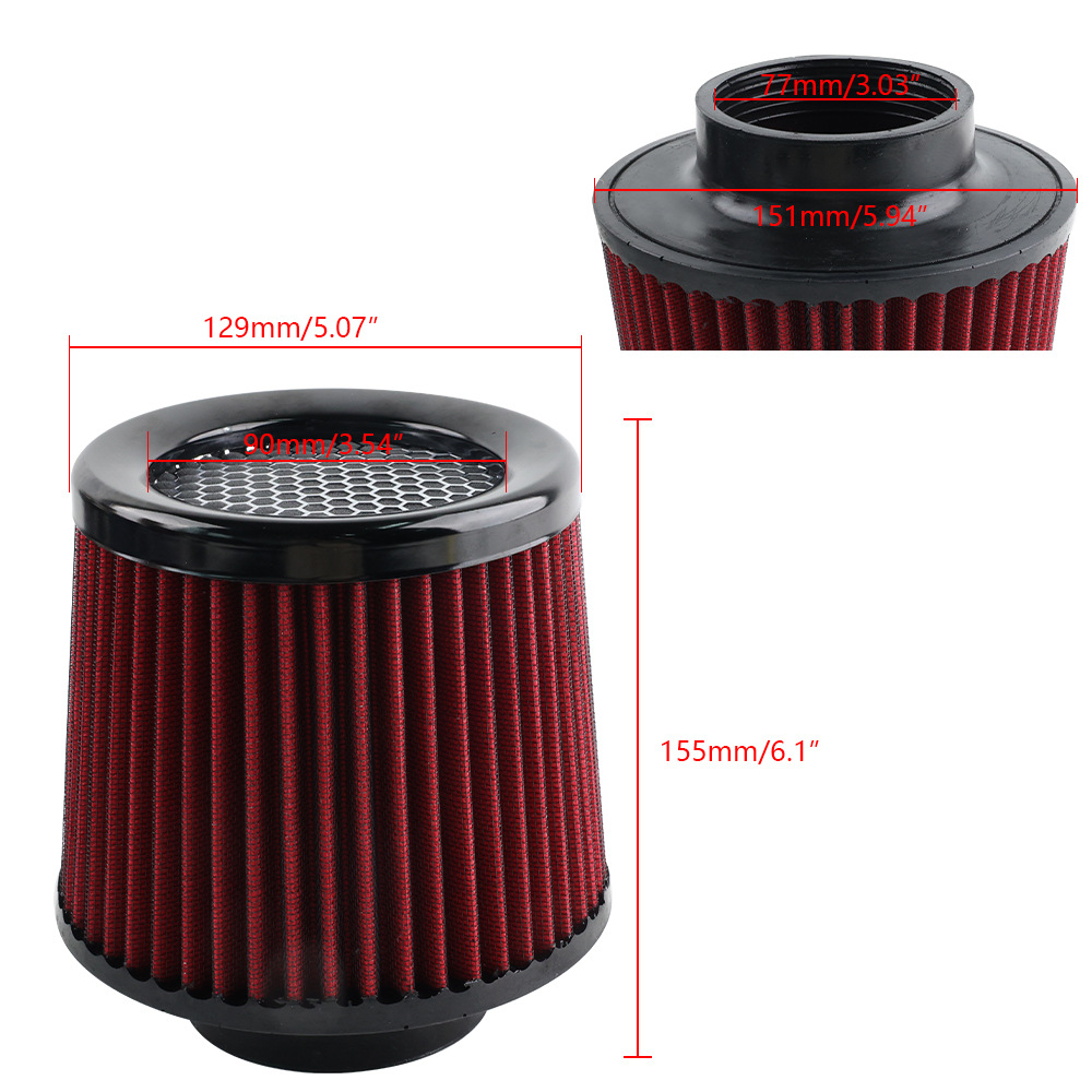 High Flow Dry Cone Air Filter (3″ 76mm Diameter) for Universal Car Cold Air Intake Systems
