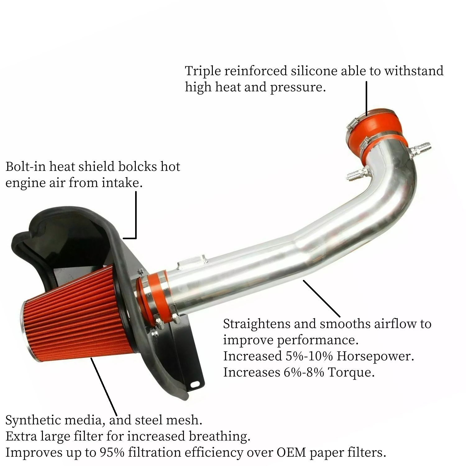 • Transform your engine bay with a sleek, sporty aesthetic. The polished silver pipe and bold red filter elevate your vehicle’s performance look, creating an immediate impact.