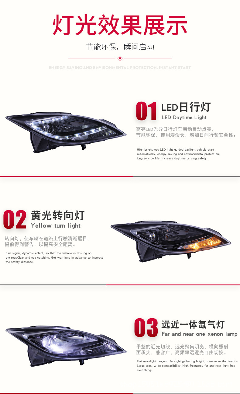 - Enhanced Visibility & Style: Features integrated LED Daytime Running Lights (DRL) and Bi-Xenon projector lenses, providing superior illumination, improved safety, and a modern, aggressive look for your vehicle.