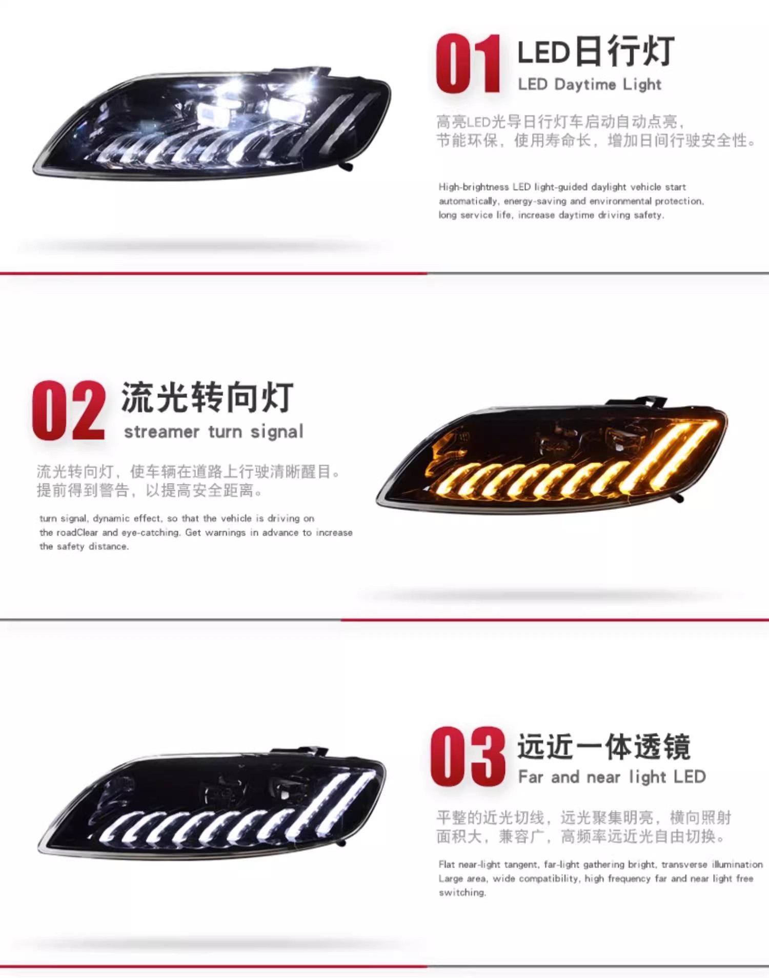 - Enhanced Aesthetics & Style: Features modern LED daytime running lights (DRL) and dynamic flowing turn signals, transforming your vehicle’s front end with a sleek, contemporary look and improved visibility.