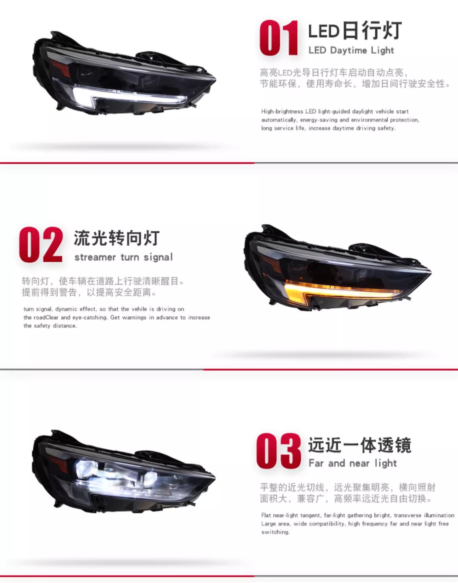 - Modern Design & Style Upgrade: Transform your vehicle’s aesthetics with a state-of-the-art headlight assembly featuring brilliant LED daytime running lights (DRL) and dynamic flowing turn signals, giving your car a contemporary and aggressive look.