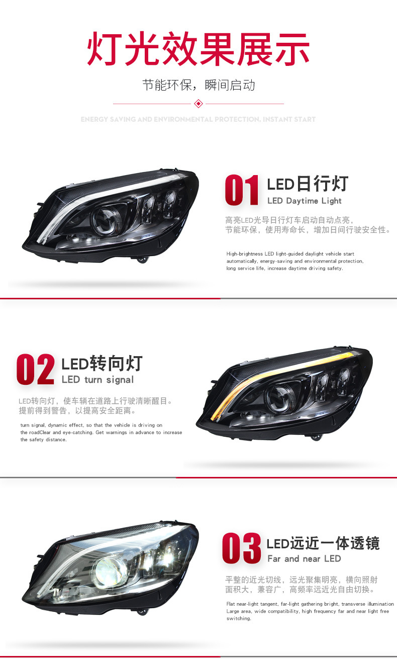 - Package Includes: Each set contains one pair of headlight assemblies for the Mercedes Benz C-Class W205, ready to transform your vehicle’s front end.