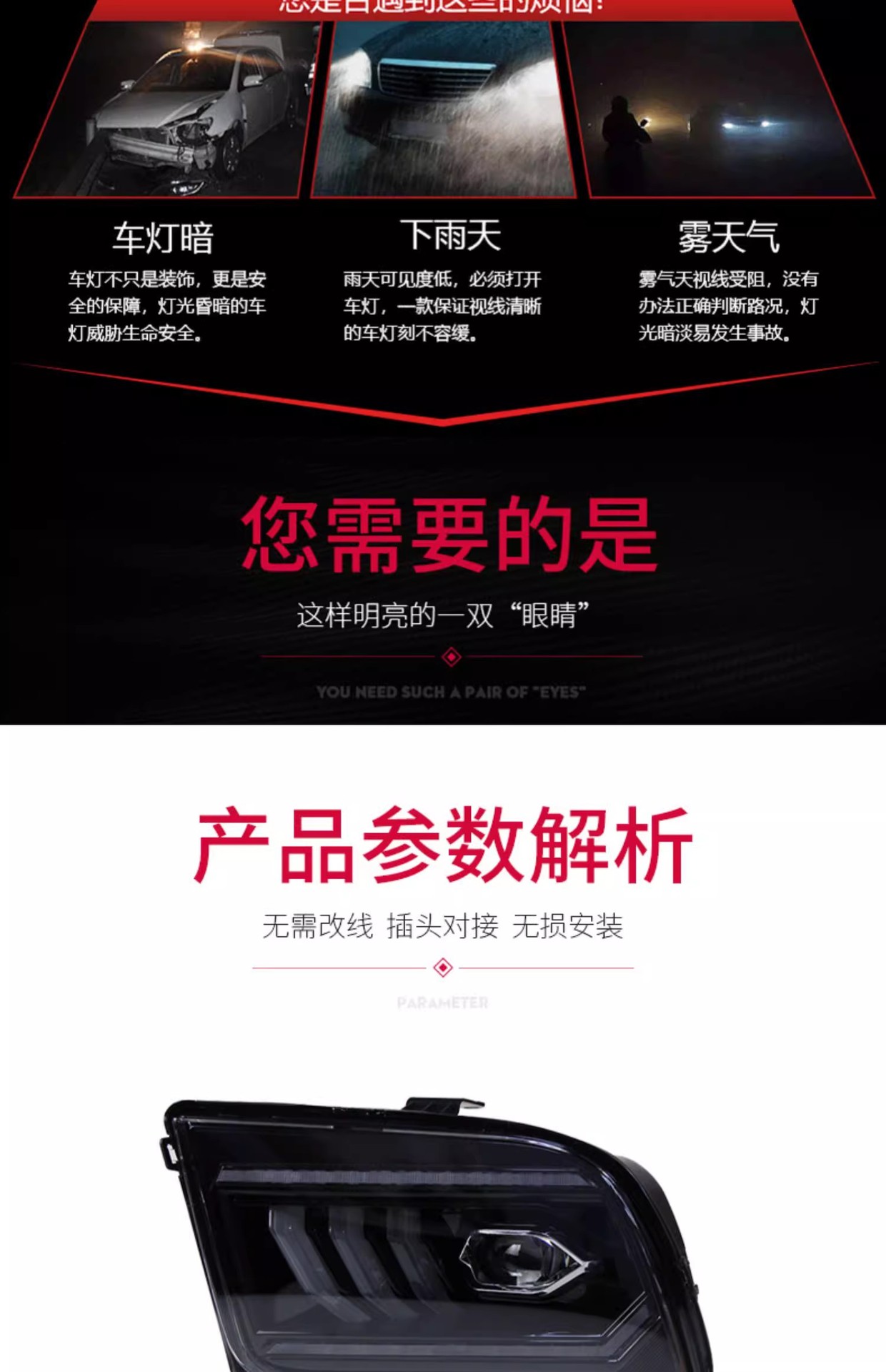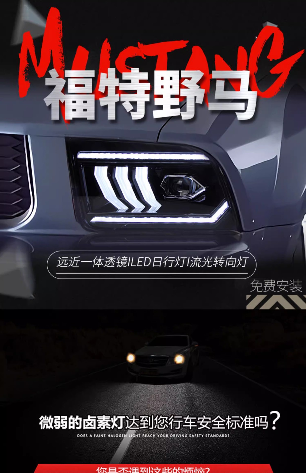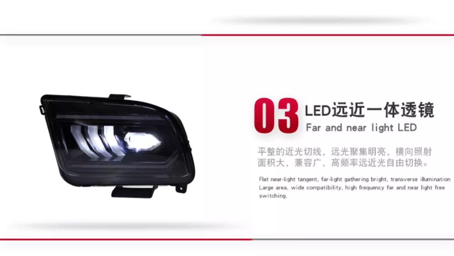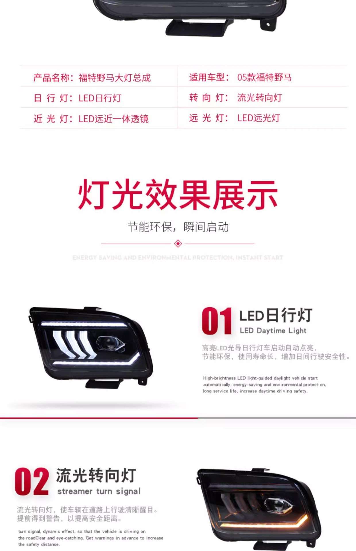 - Enhanced Aesthetics: Features brilliant LED Daytime Running Lights (DRL) and dynamic sequential turn signals, transforming your Mustang’s front-end appearance with a modern, aggressive look.
