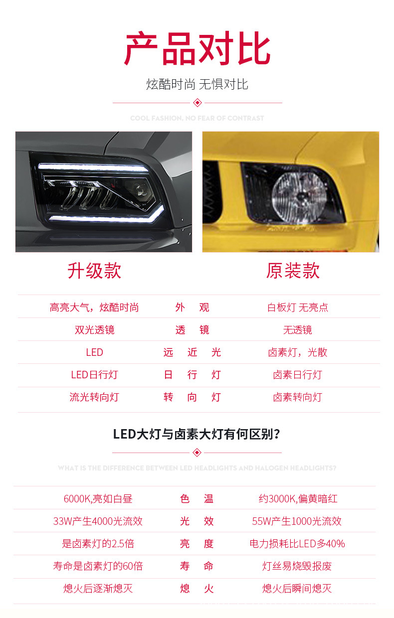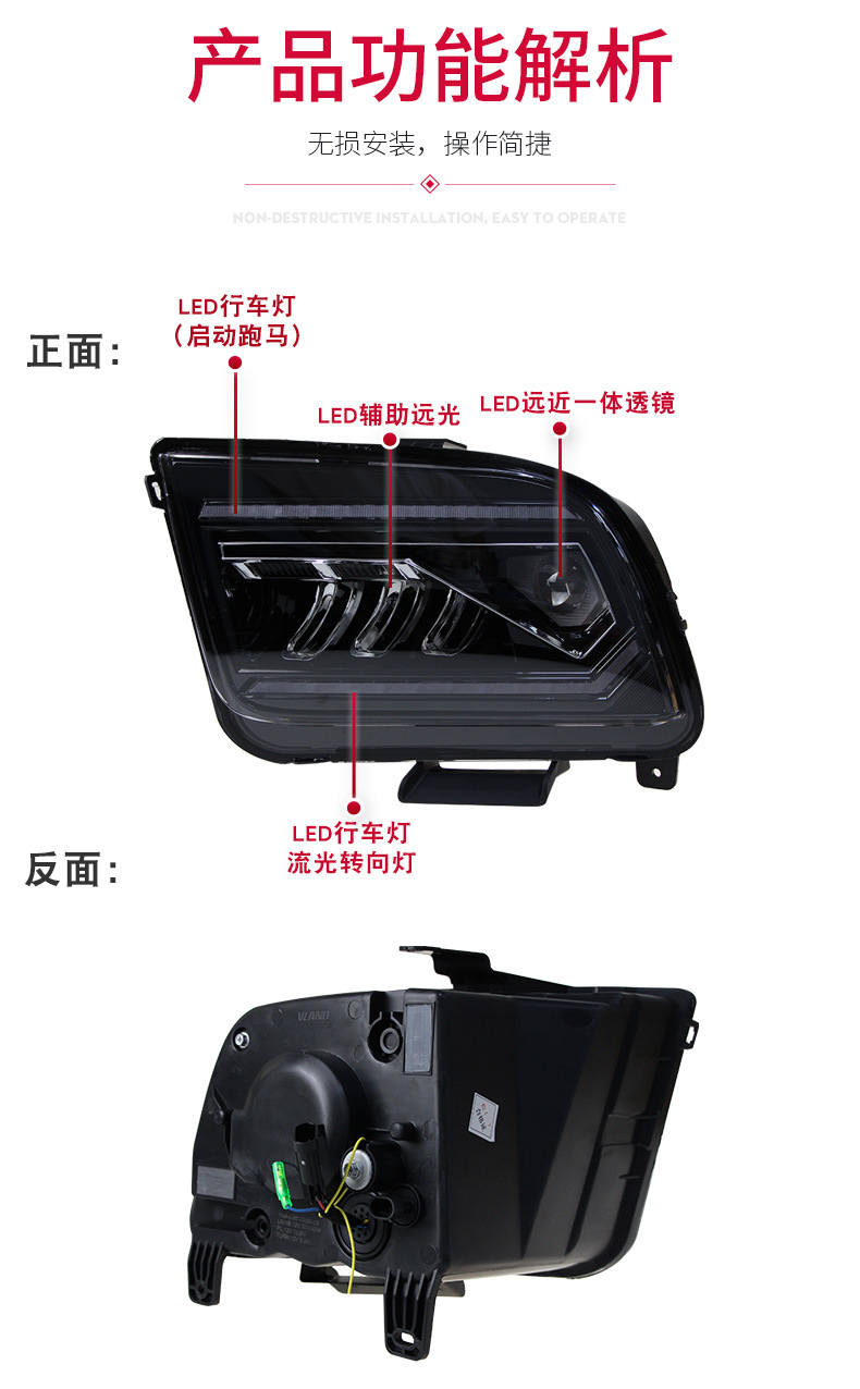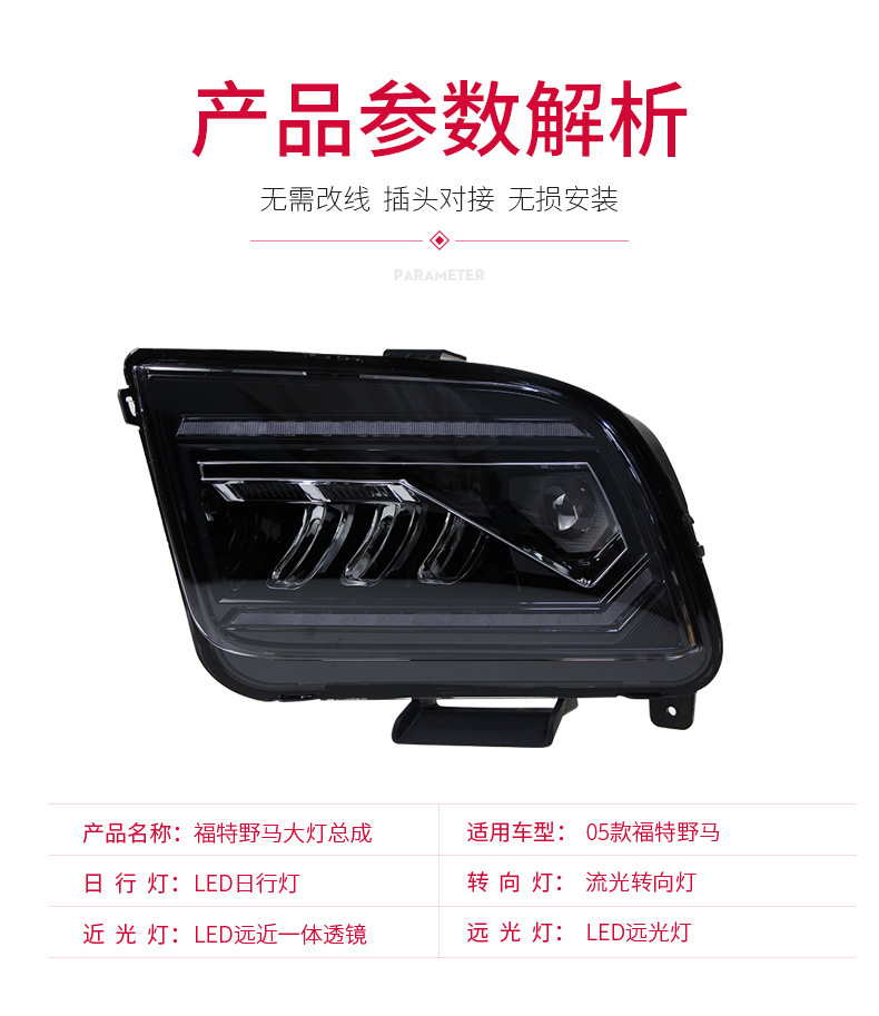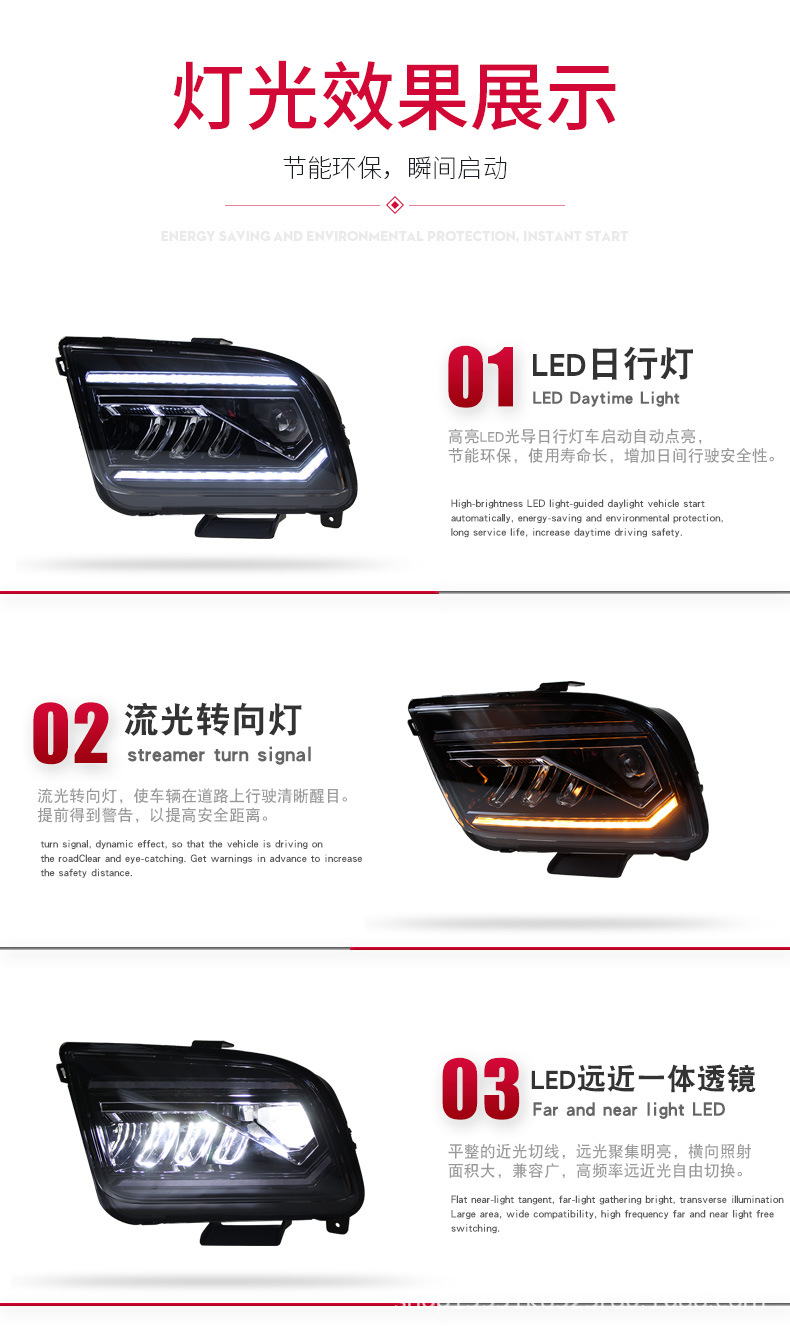 - Modern Styling: Features brilliant LED Daytime Running Lights (DRL) and dynamic sequential turn signals, upgrading your Mustang’s aesthetics with a modern and distinctive look.