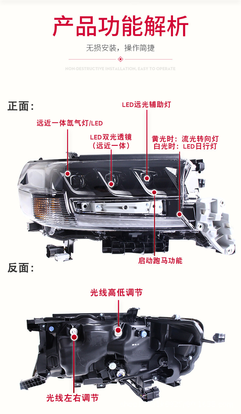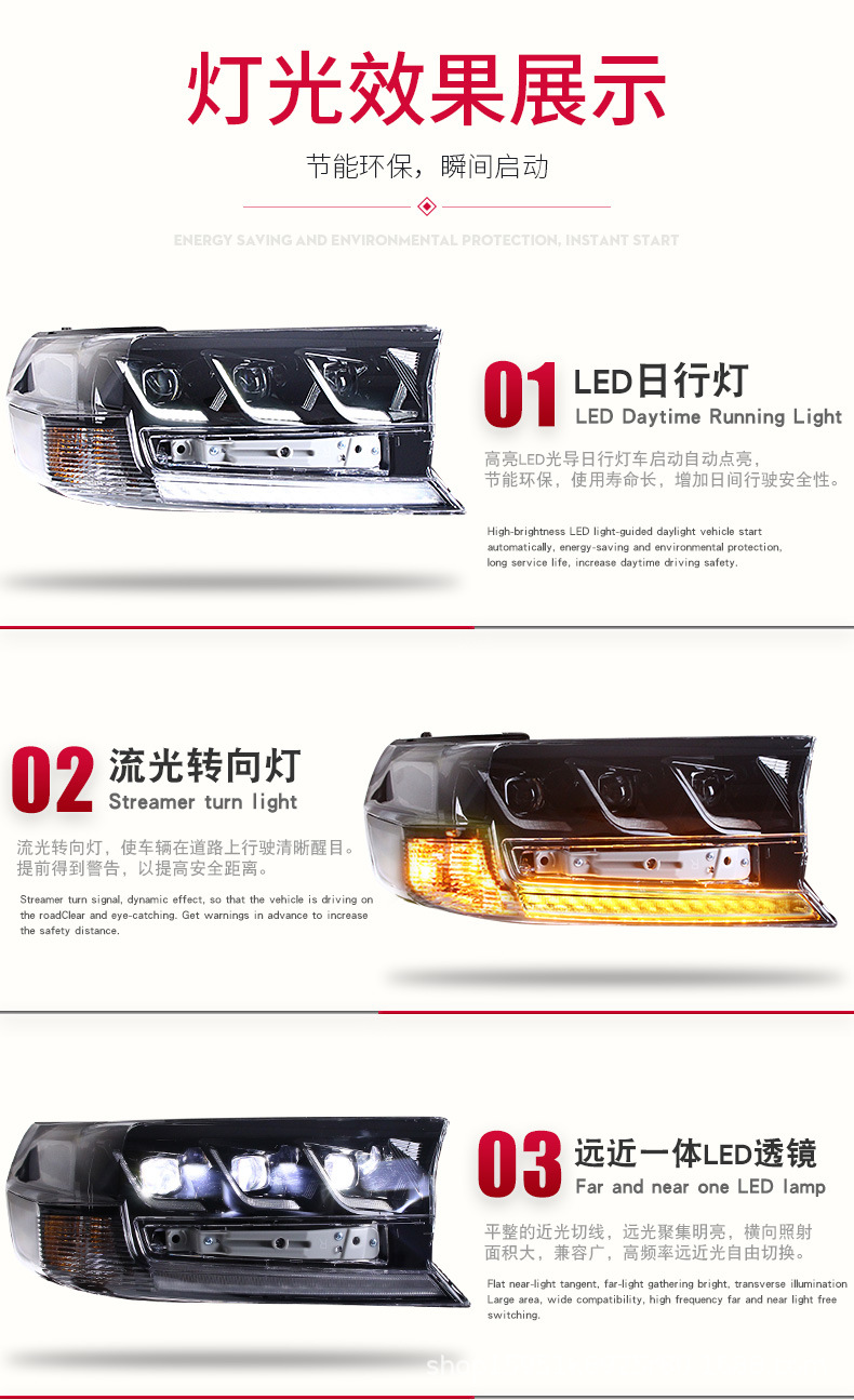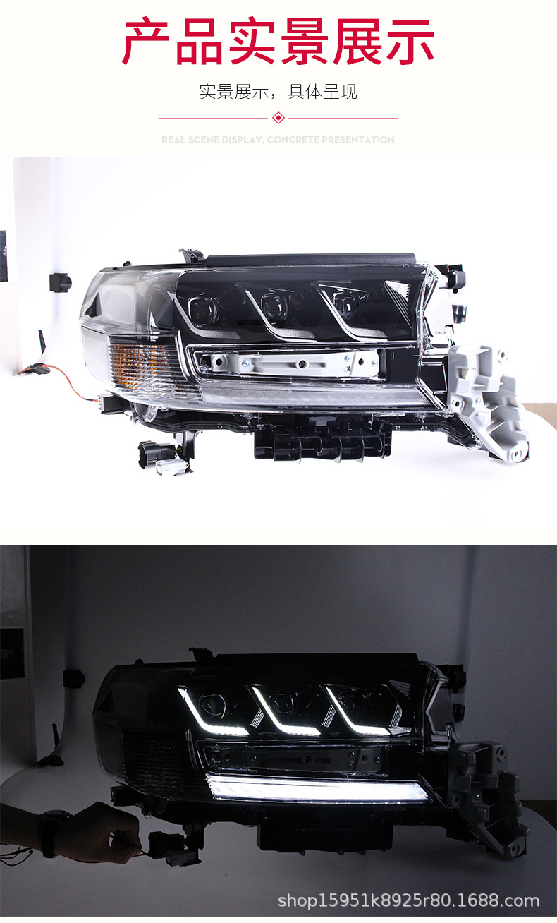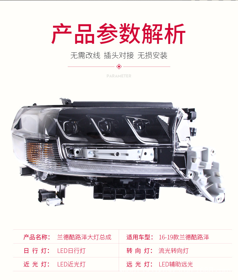 - Enhanced Aesthetics: Transform the front-end look of your Land Cruiser with this sleek LED headlight assembly. The integrated design and crystal-clear lens provide a more aggressive and contemporary appearance, setting your vehicle apart.