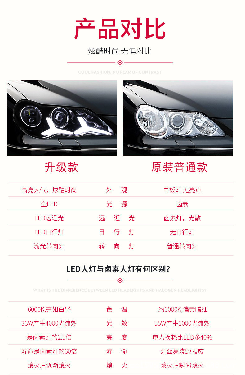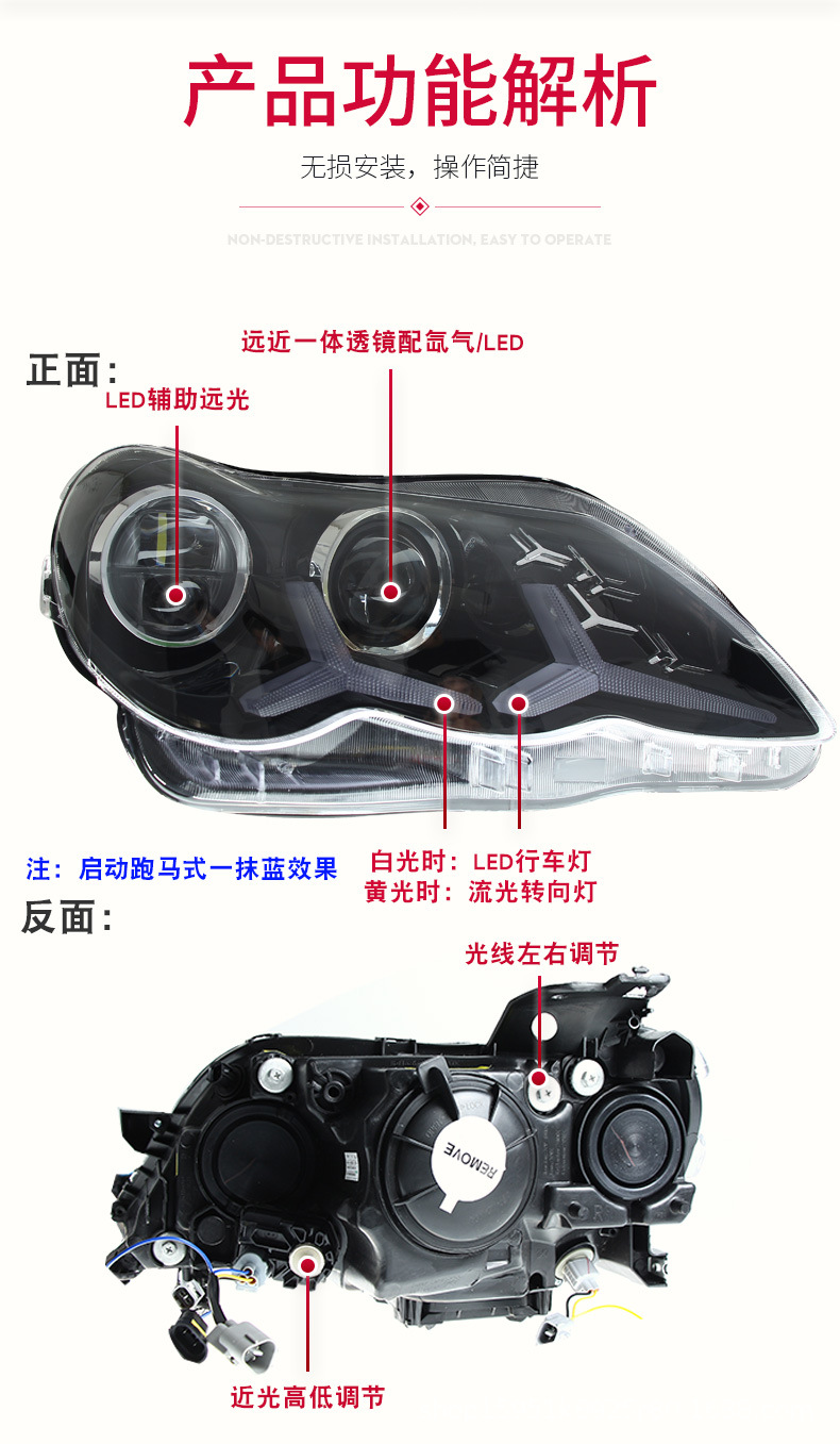 - Modern Lighting Design: Features advanced LED projector lenses for superior light output, integrated LED daytime running lights (DRL), and dynamic sequential turn signals, upgrading your vehicle’s aesthetic and visibility.
