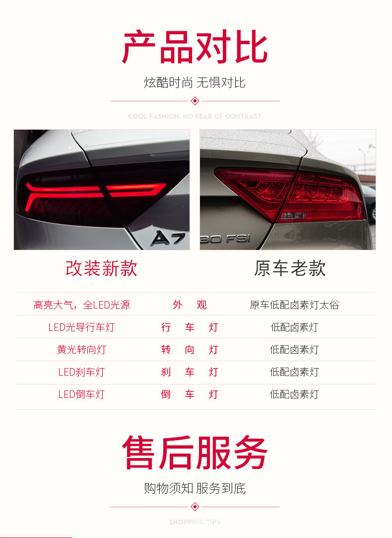 - Dynamic Sequential Turn Signals: Upgrade your A7 with modern flowing amber LED turn signals that provide a distinctive, eye-catching visual effect, improving safety and aesthetics.