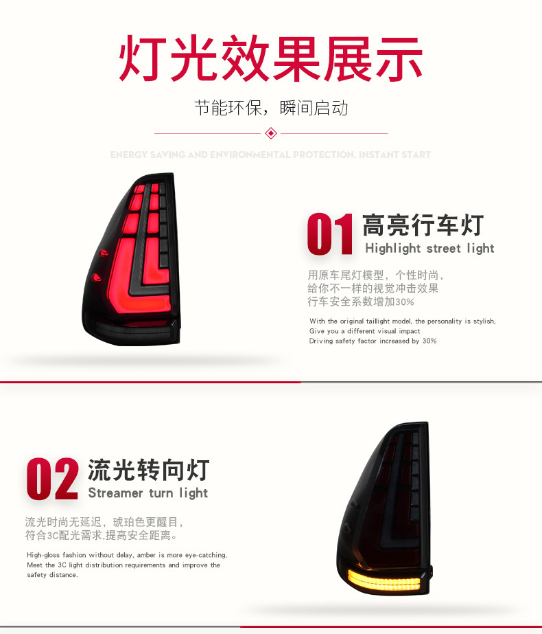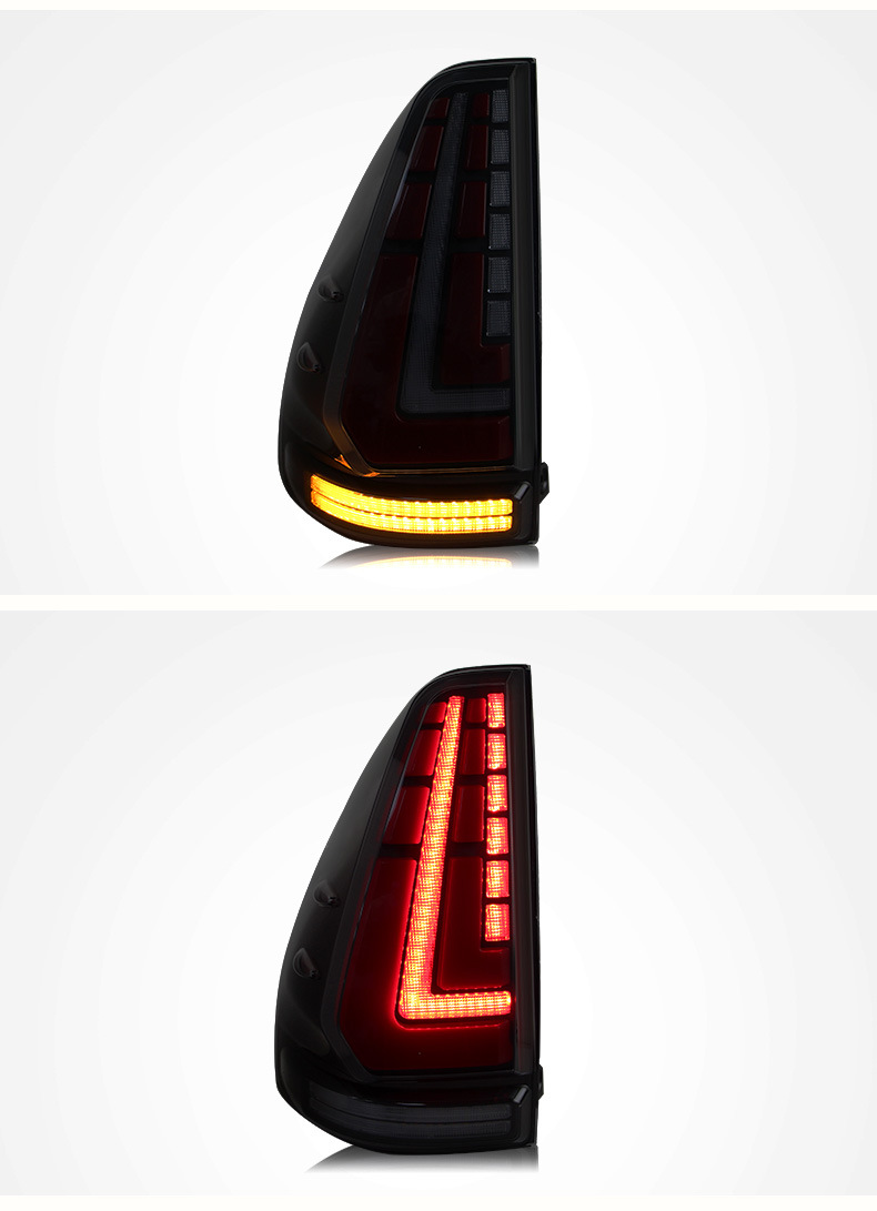 - Modern Aesthetics: Features a sleek LED smoked lens design with dynamic streamer flowing turn signals, transforming the rear appearance of your Prado with a contemporary and aggressive sportscar-inspired look.
