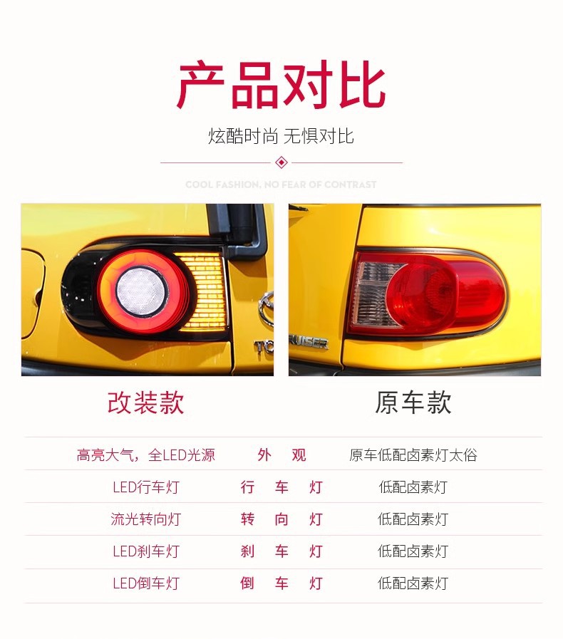 - Ferrari-Style LED Lighting: Upgrade your FJ Cruiser with modern Ferrari-inspired LED tail lights, featuring striking sequential turn signal functionality for enhanced visibility and a distinctive look.