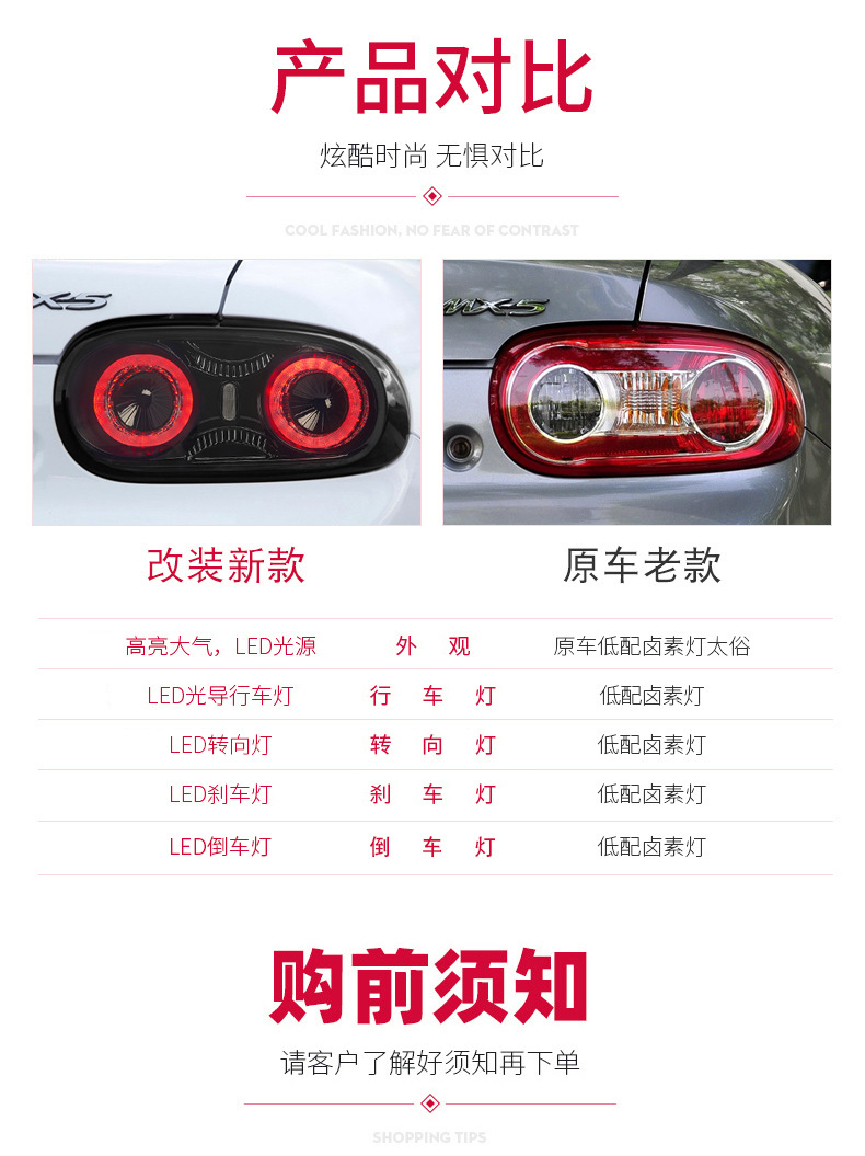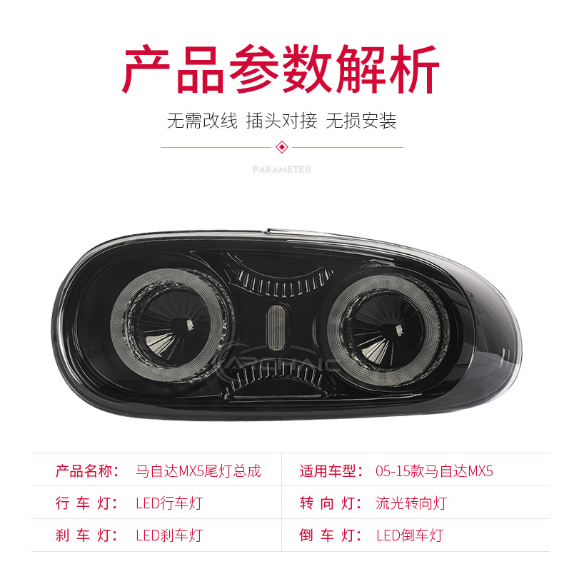 - Direct Fitment: A perfect replacement for Mazda MX-5 2005-2015 models. Includes taillight, turn signal, brake light, and reverse light functions.