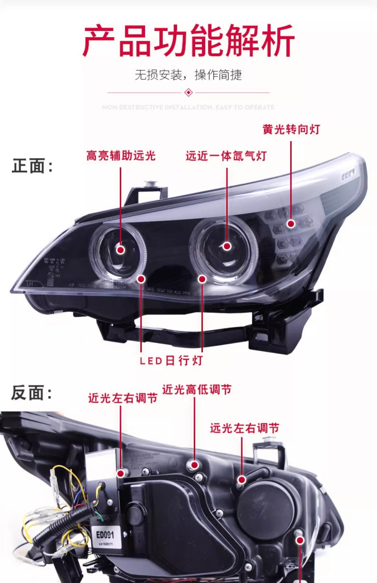 - Performance-Driven Design: Features integrated projector lenses for high/low beam, bright LED Angel Eyes DRLs, and yellow-light turn signals, as shown, to enhance visibility and modernize the vehicle’s appearance.