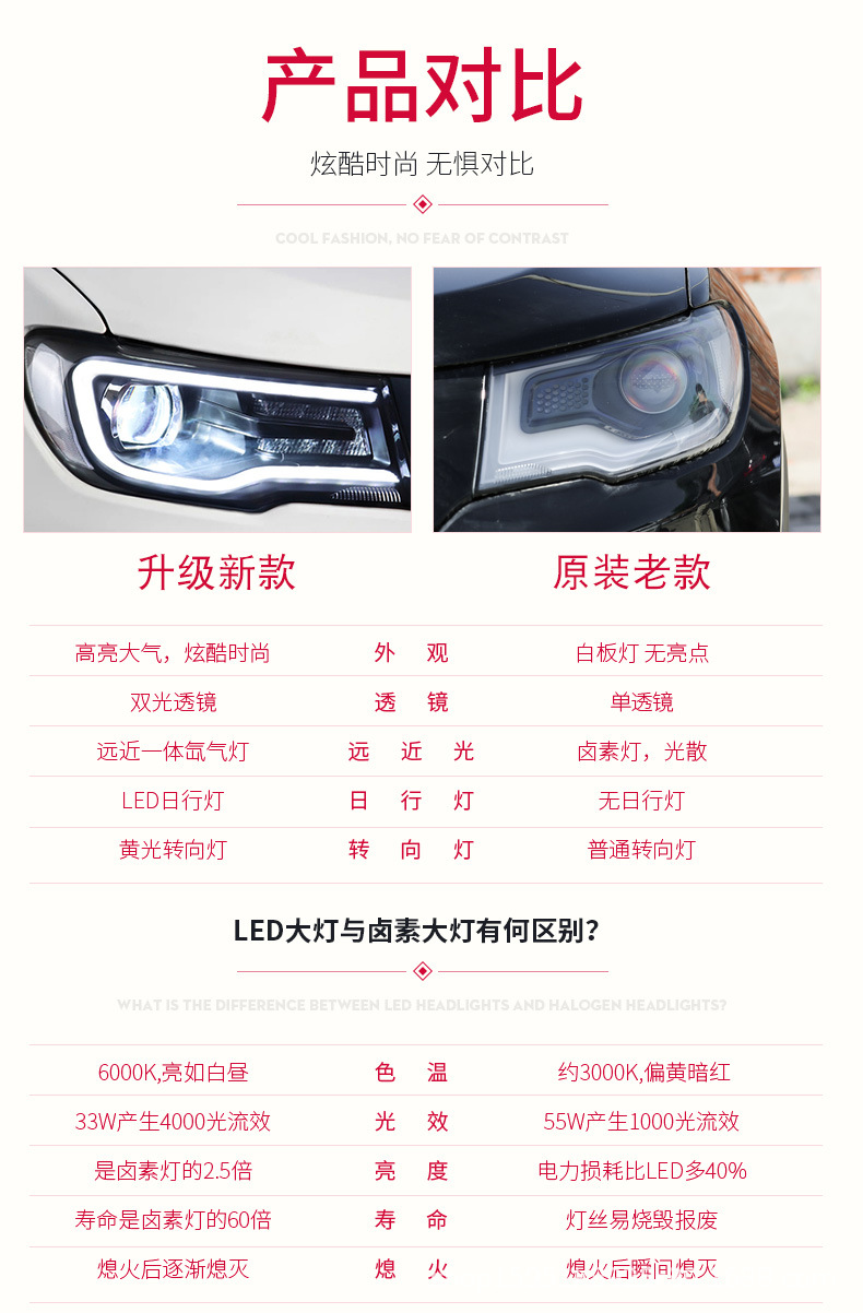 - Modern Aesthetic Upgrade: Features integrated LED daytime running lights that add a sleek, contemporary look to your vehicle, significantly enhancing its visual appeal both day and night.