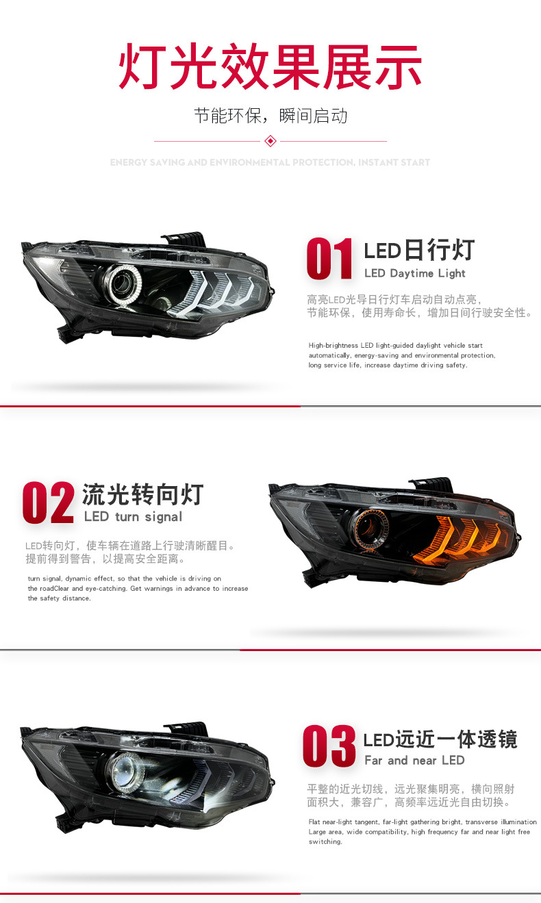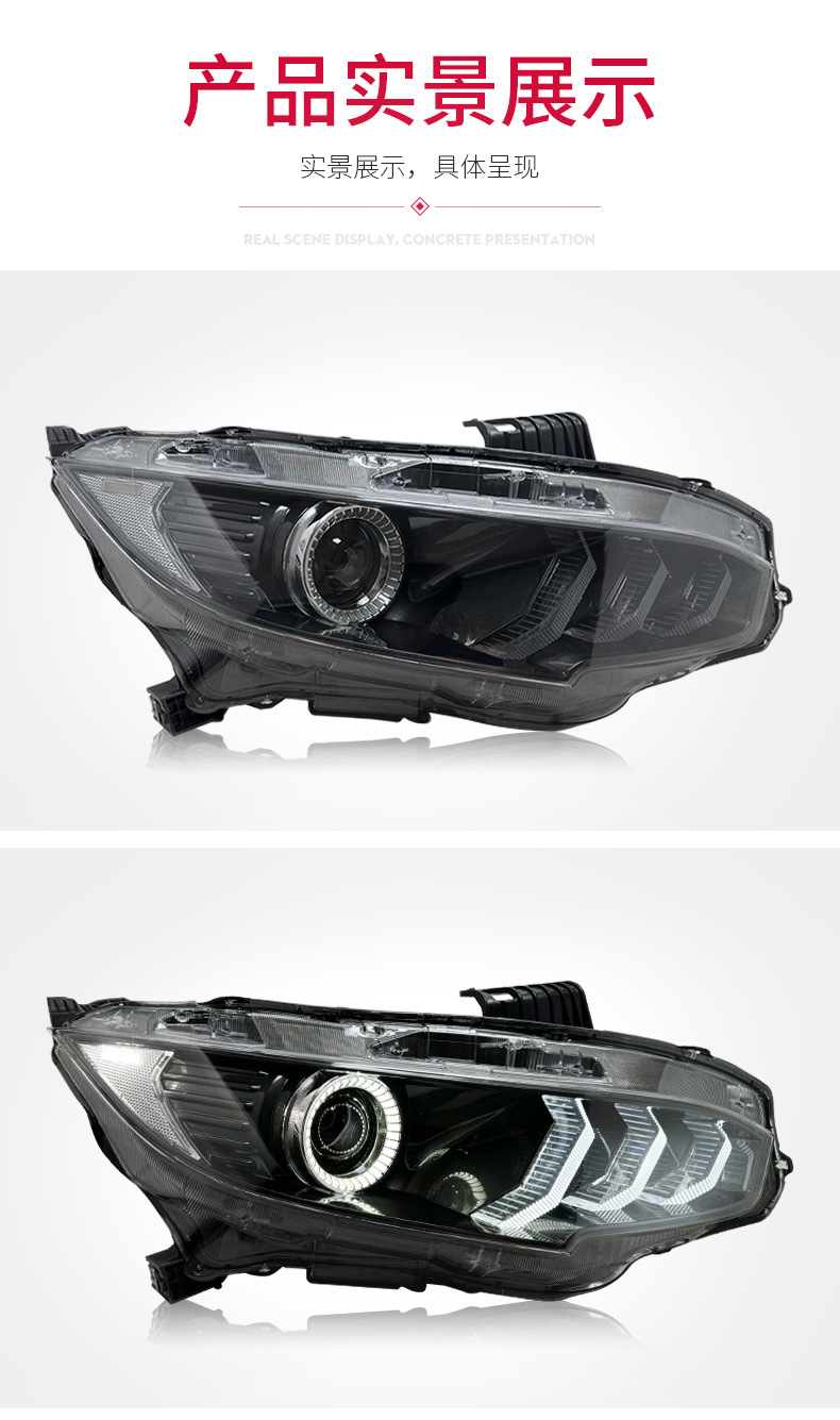- Enhanced Styling: Features aggressive LED Mustang-style Daytime Running Lights (DRL) and dynamic flowing turn signals, transforming your Civic’s front-end aesthetics with a modern, sporty look.