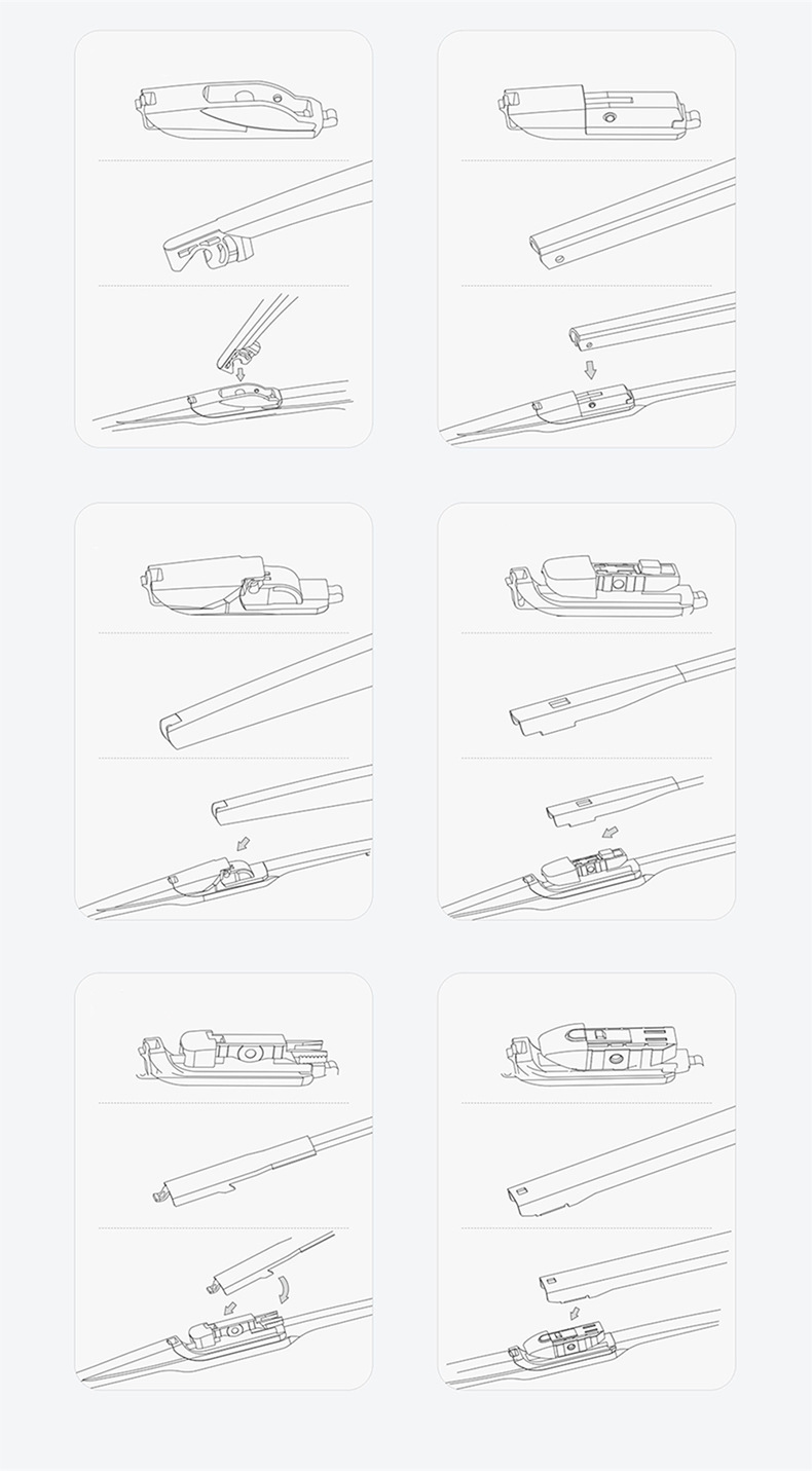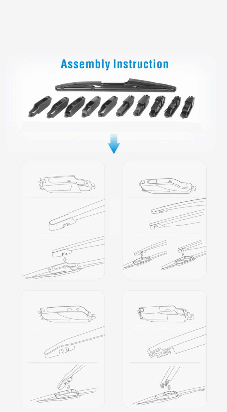 - Performance-Driven Design: Equipped with an array of interchangeable adapters (e.g., 7.0x12mm, 4.0x11mm, 15mm hole) to match diverse rear wiper arm types, as shown in the visual guide.