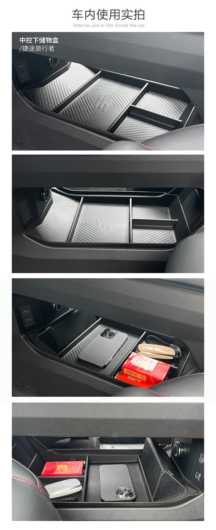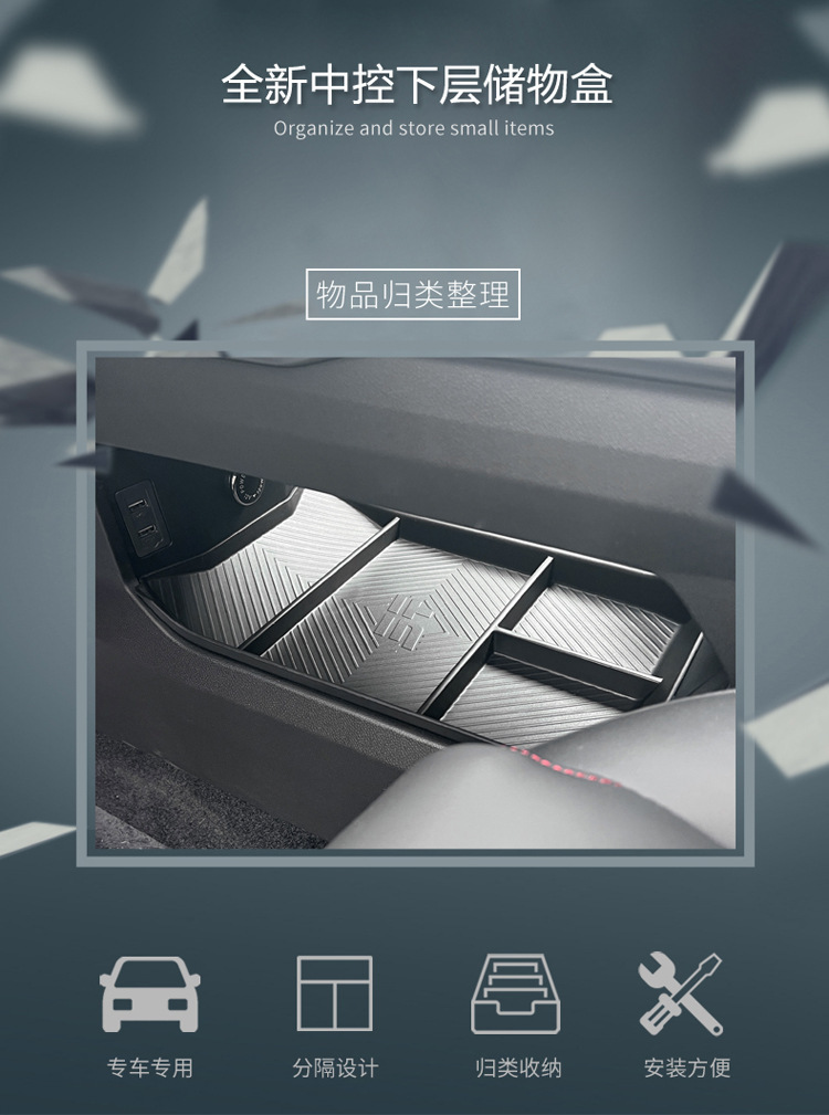 - Performance-Driven Design: Features multiple partitioned compartments, as shown, to organize items effectively and prevent clutter in the center console.