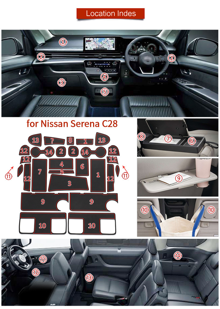 - Complete Package: Includes a full set of interior door slot and console mats, exactly as pictured, to cover all designated areas within your Nissan Serena C28. Please verify fitment details before purchasing.