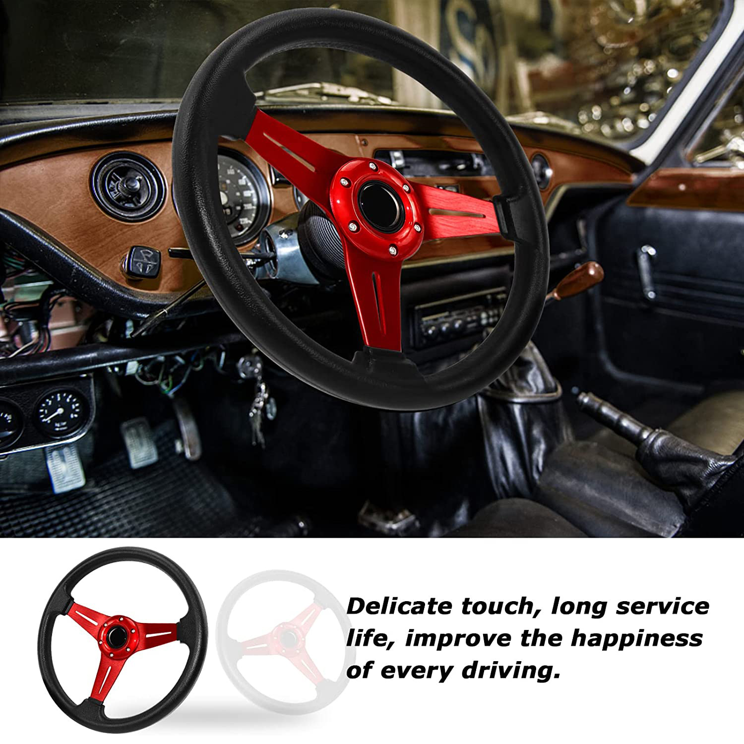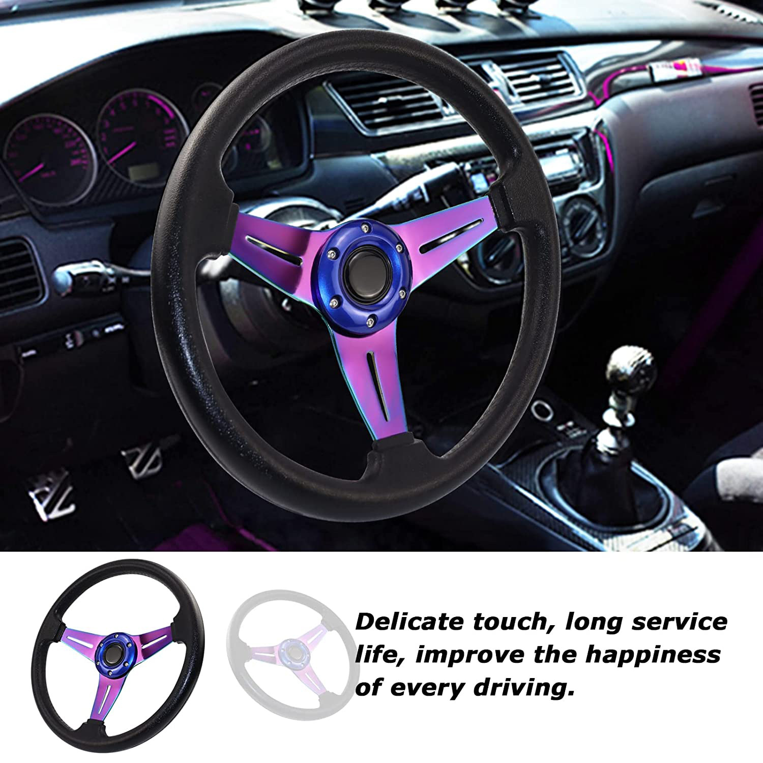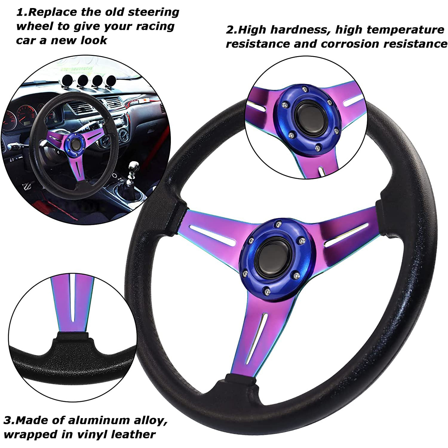 - Stylish Design & Enhanced Aesthetics: Available in multiple vibrant colors including red, blue, black, gold, silver, purple, and carbon fiber texture, this racing steering wheel adds a sleek and sporty touch to your car’s interior.