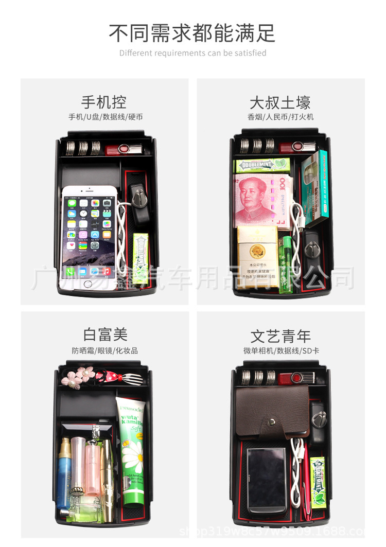 - Performance-Driven Design: Features multiple compartments including a coin holder and a designated storage area for cards and a phone, as pictured, to keep your armrest organized and tidy.