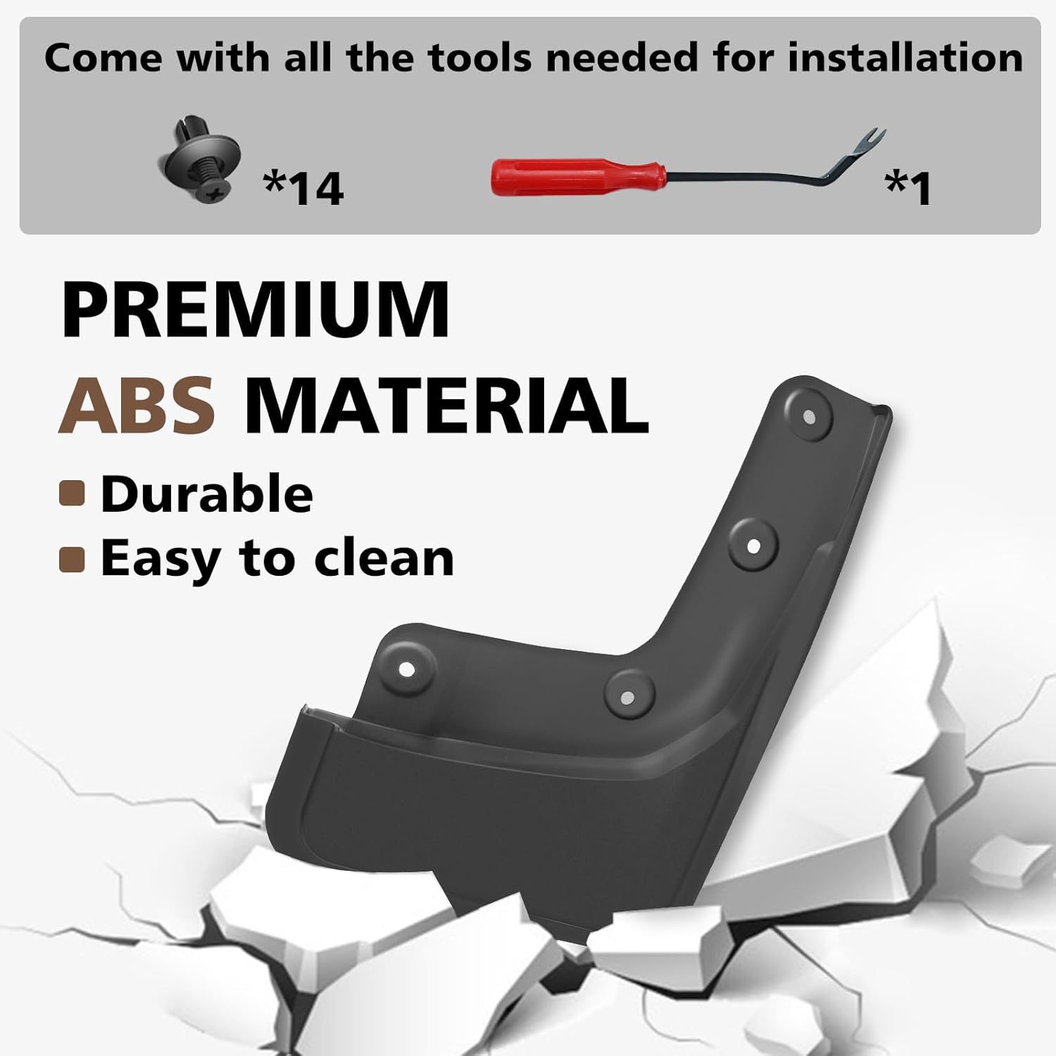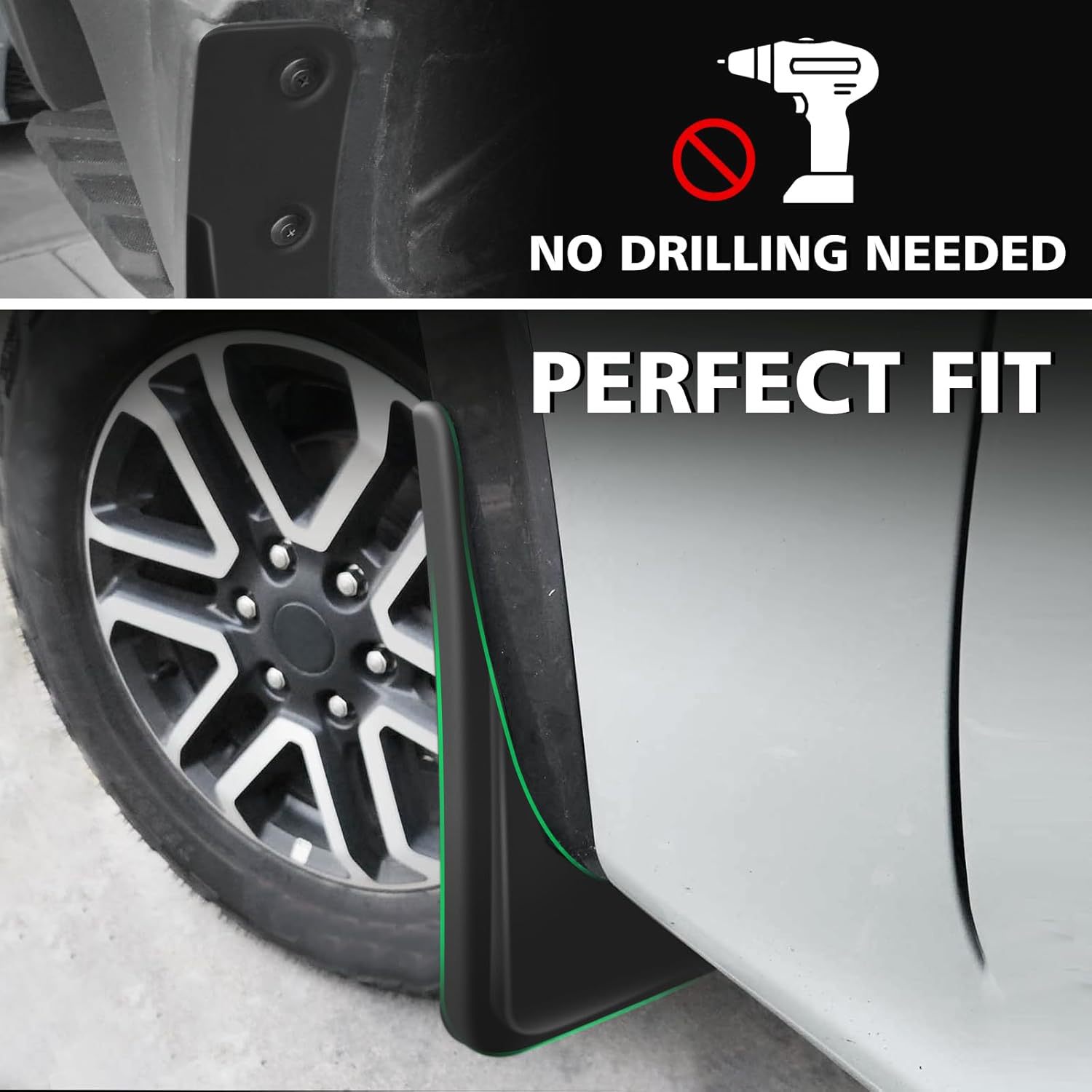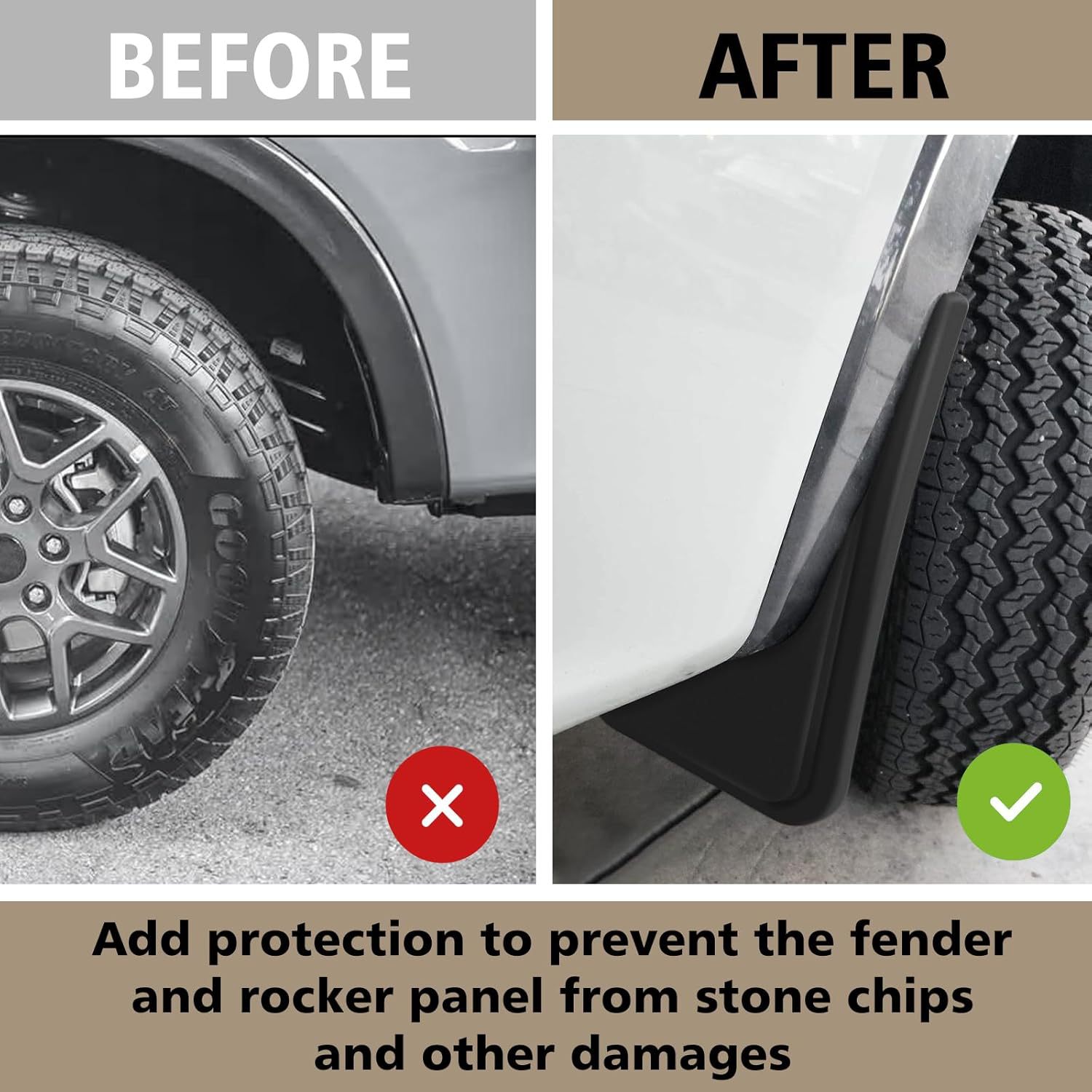 - Comprehensive Protection: Includes a full set of mud flaps to guard your vehicle’s paint, undercarriage, and rocker panels from mud, rocks, and road salt, extending your vehicle’s lifespan and preserving its finish.