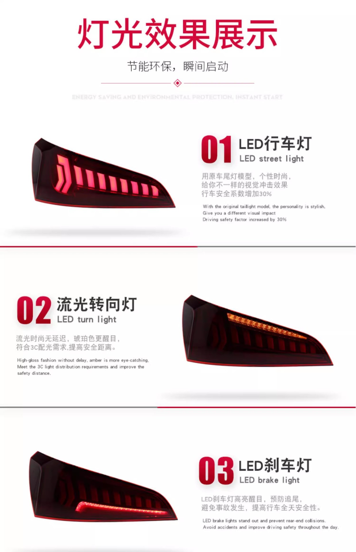 - Enhanced Styling: Features modern LED running lights, dynamic sequential turn signals (flowing light), and crisp brake lights, significantly upgrading your Audi Q5’s rear aesthetics and visibility.