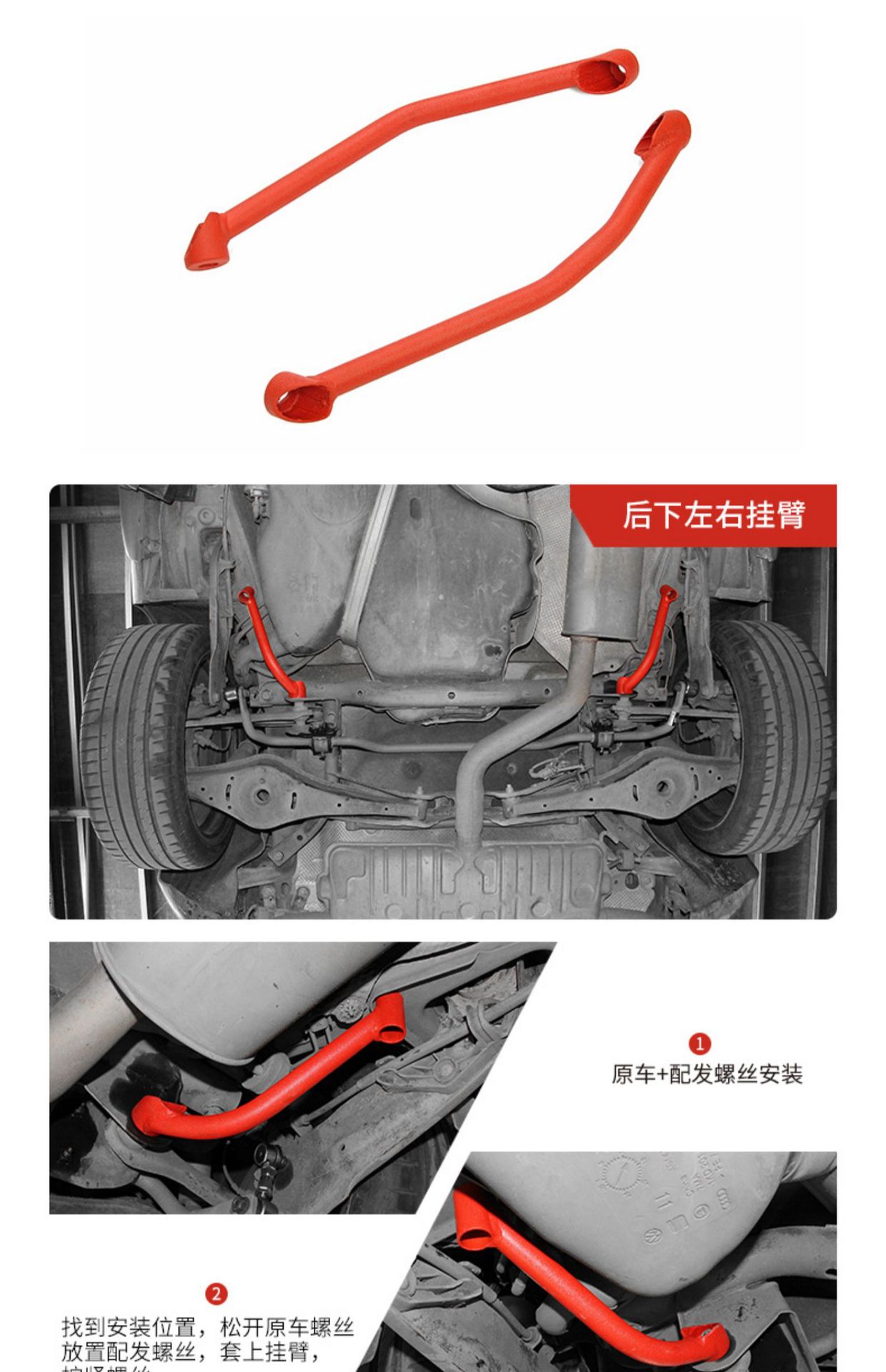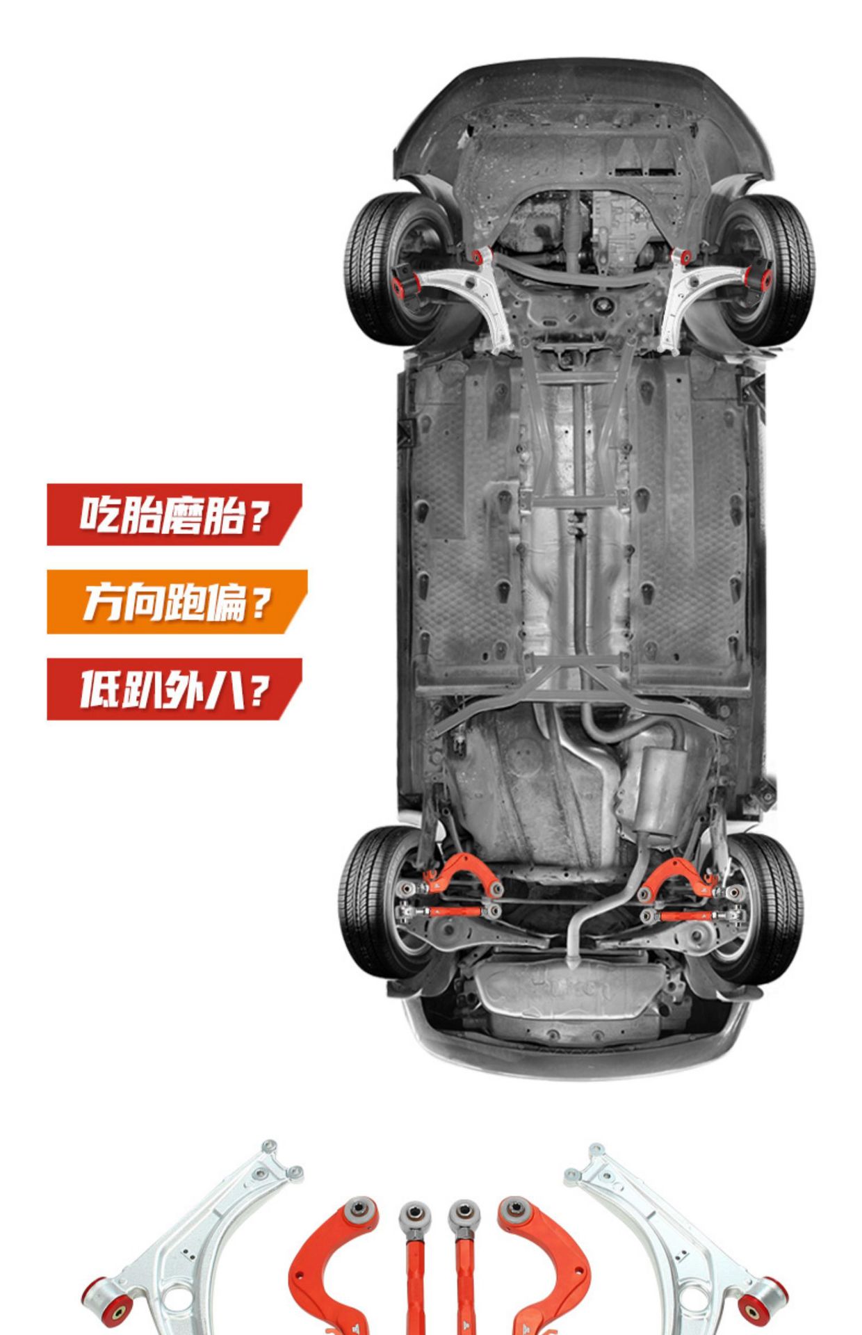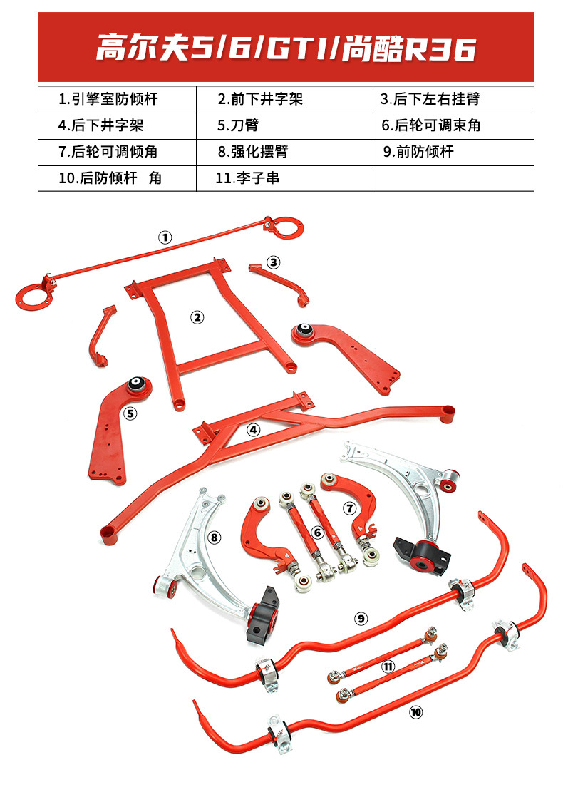 - Comprehensive Kit: Includes a full set of front and rear anti-roll sway bars, front lower subframe brace, rear lower subframe brace, and various control arms (as per ‘五件套’), providing a complete solution for chassis stiffening.