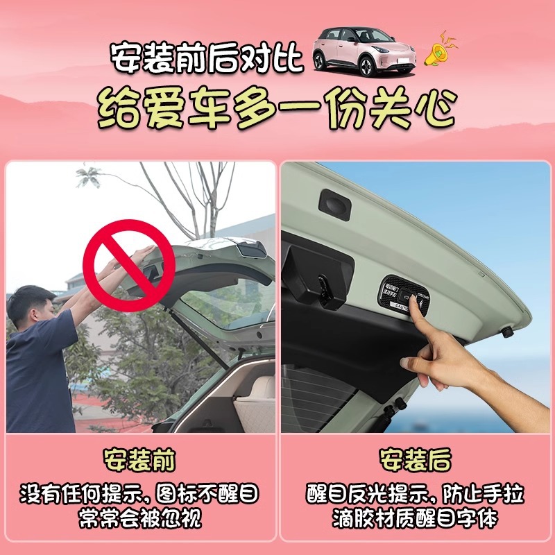 - Performance-Driven Design: Clearly warns against manual pulling of the electric tailgate with “CAUTION!” and “电动尾门 请勿手拉” (Electric Tailgate, Do Not Pull By Hand) for user safety.