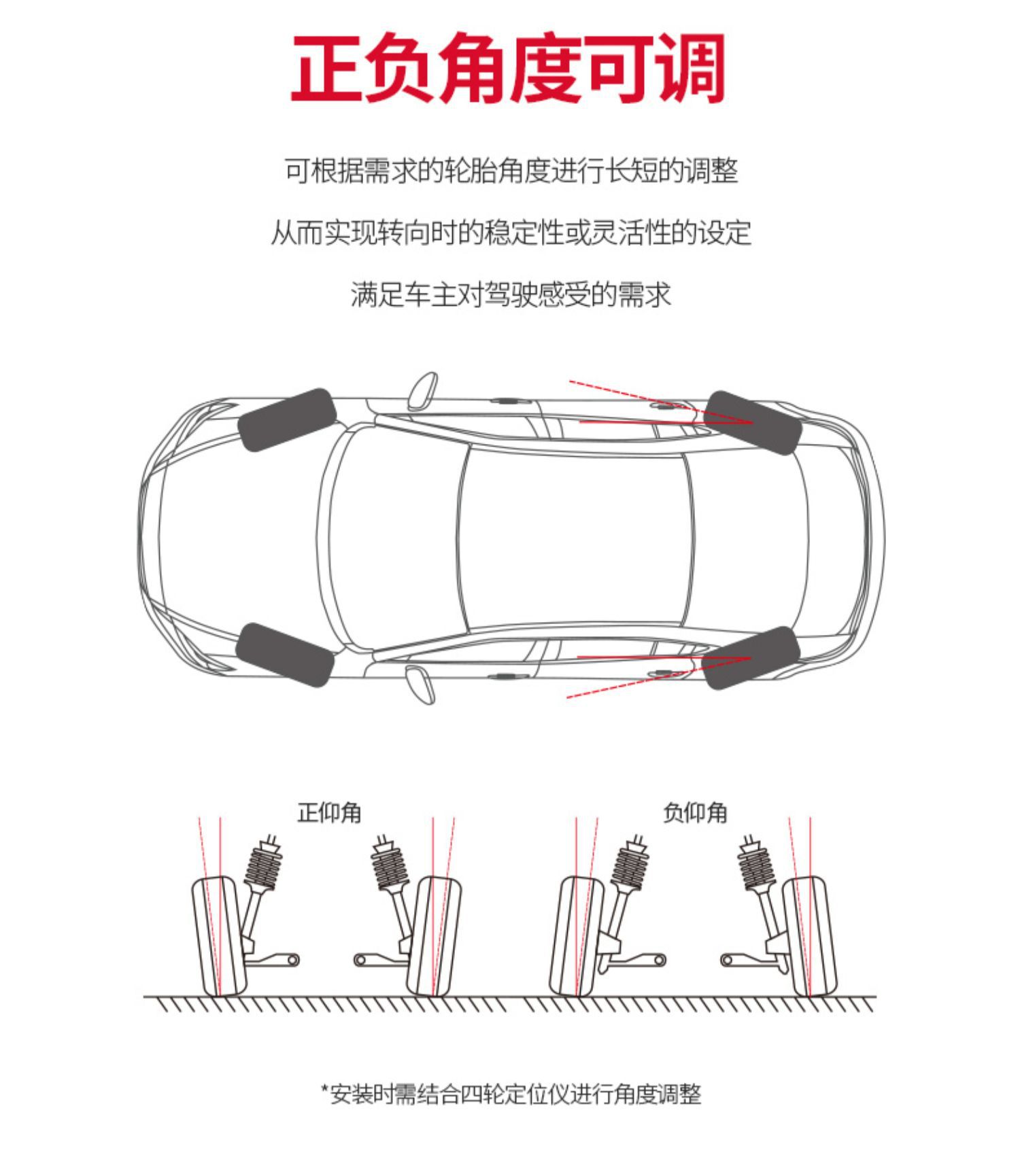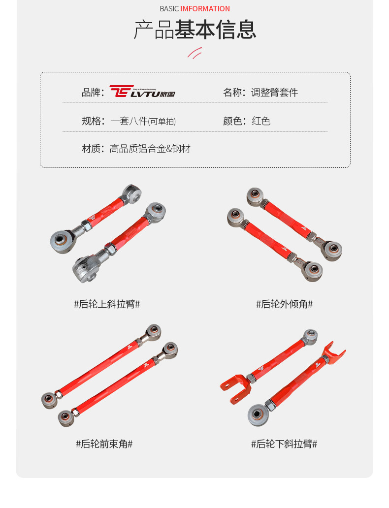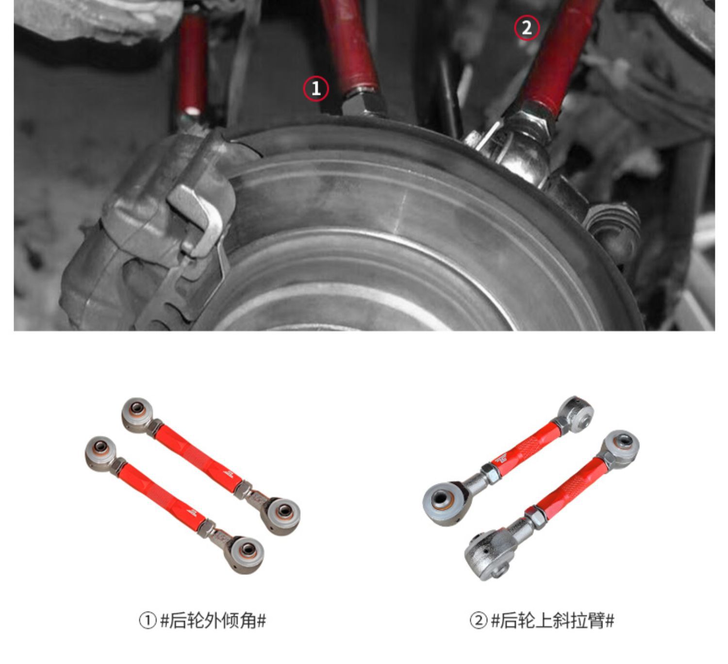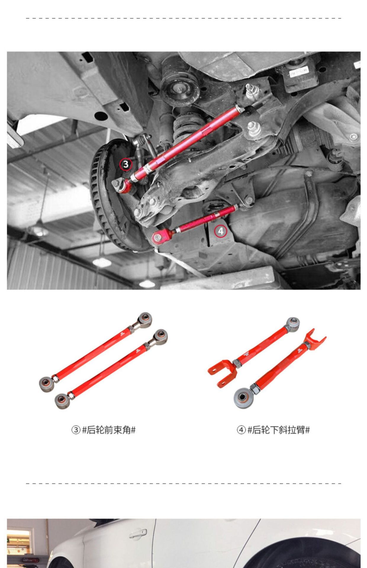 - Comprehensive Kit: Package includes 1 pair of Rear Camber Arm (Red), 1 pair of Rear Upper Slanted Pull Arm (Red), 1 pair of Rear Lower Slanted Pull Arm (Red), and 1 pair of Rear Toe Arm (Red), providing a complete solution for rear suspension tuning.