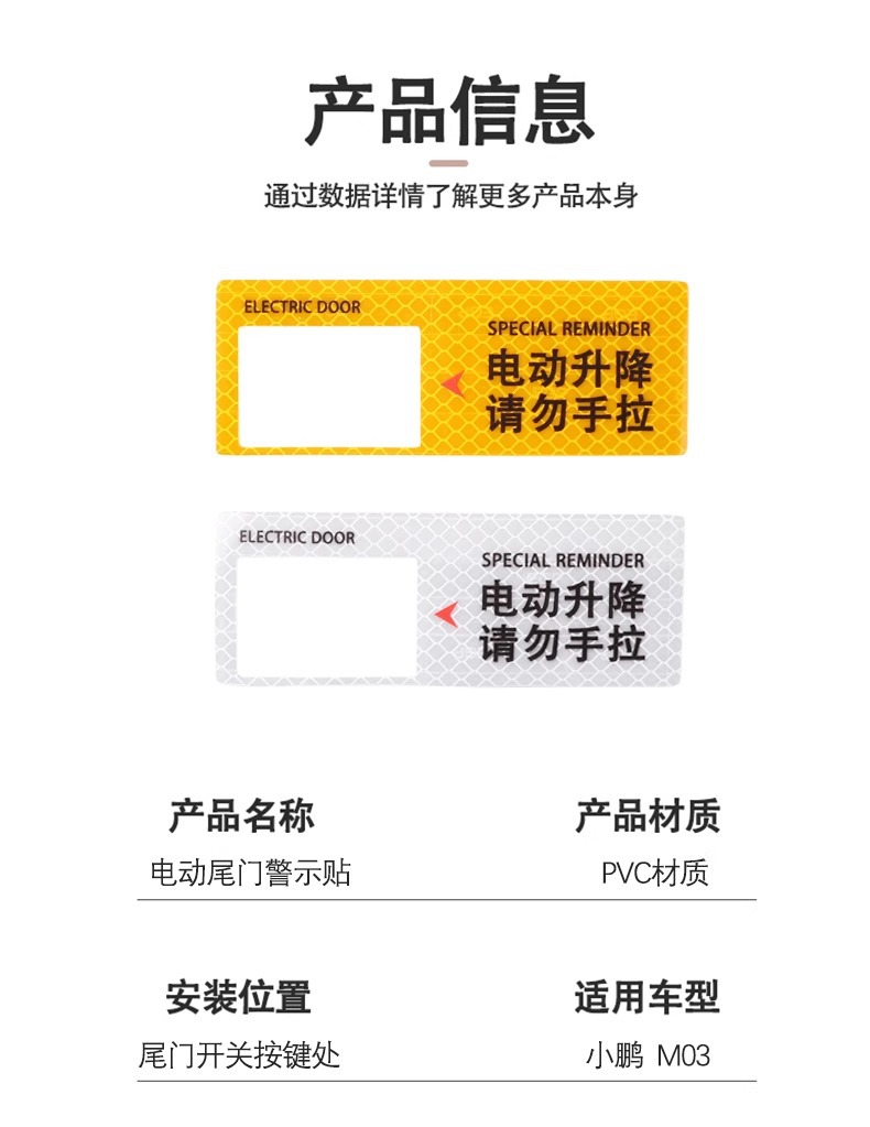 - Direct Fitment: A perfect replacement for original warning decals. Compatible with Xpeng MONA M03 electric tailgate.