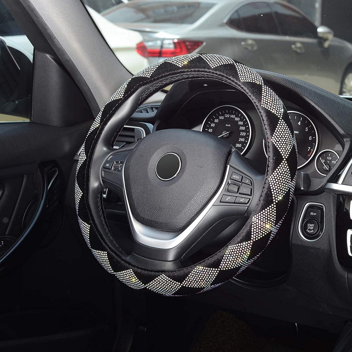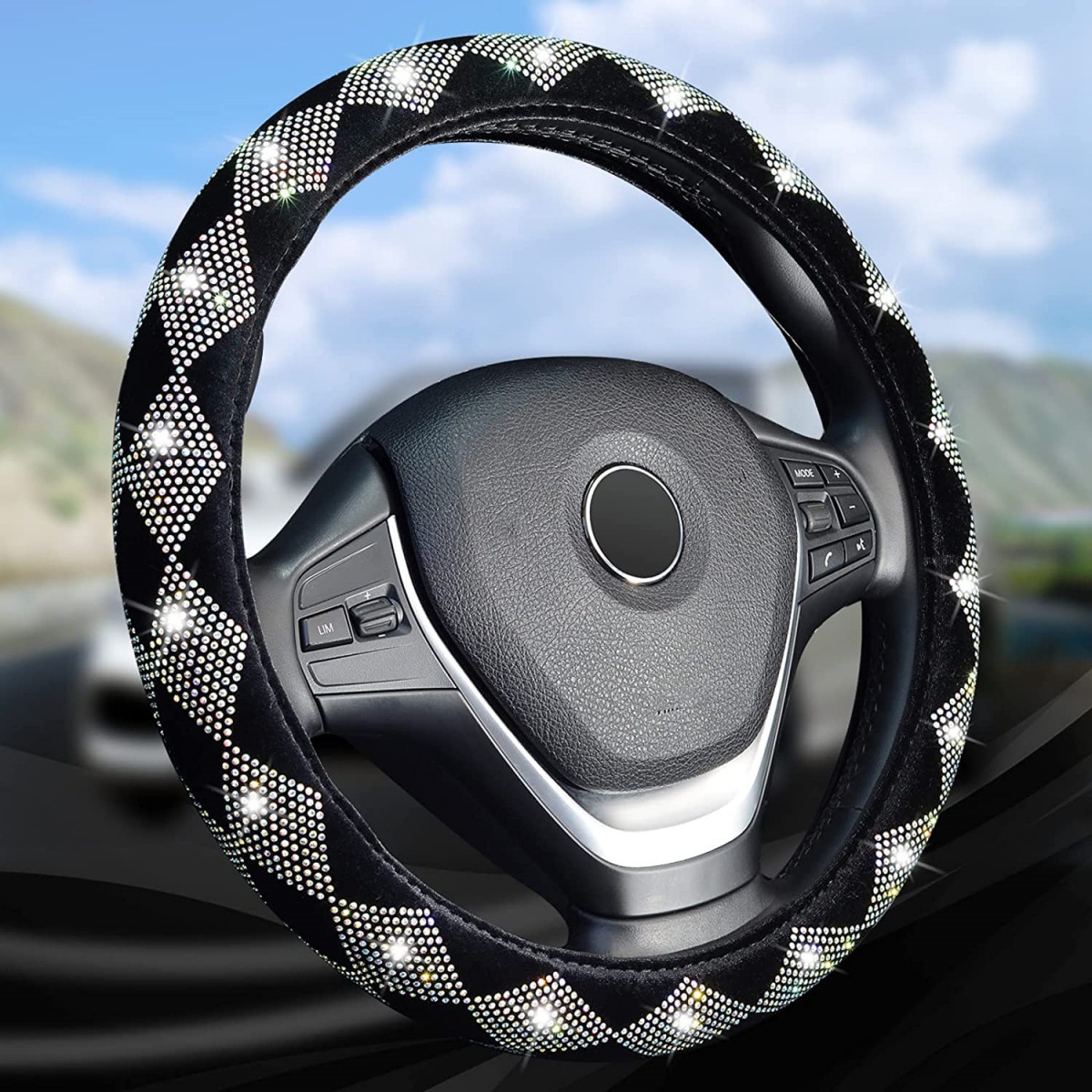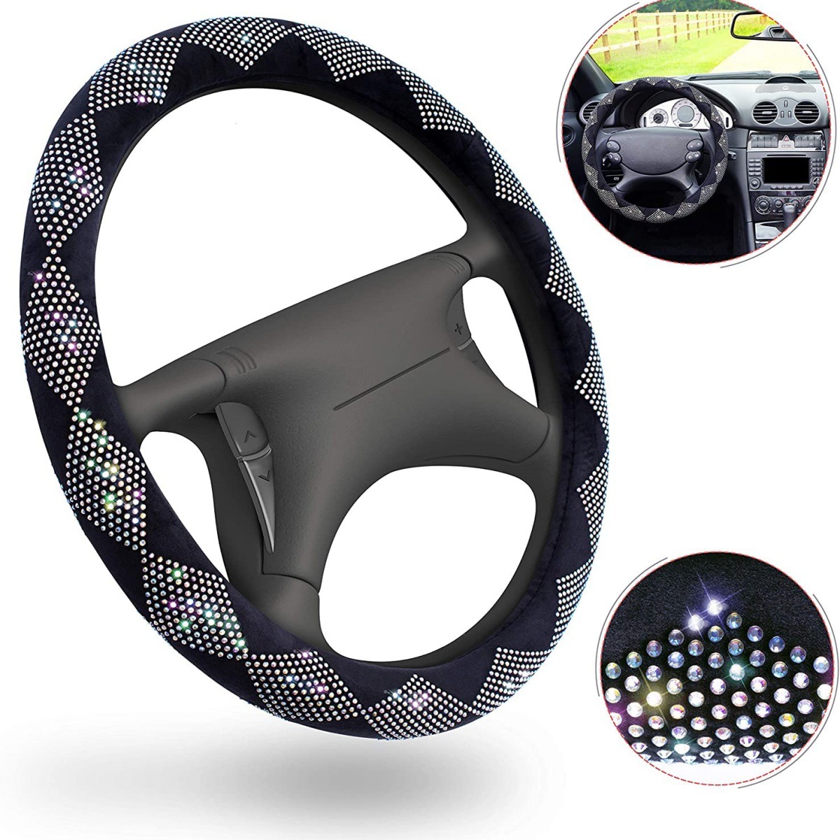 - Premium Material & Durability: Crafted with high-quality rhinestone studded material, this cover provides excellent grip, is wear-resistant, and ensures long-lasting durability, protecting your original steering wheel from daily wear and tear.