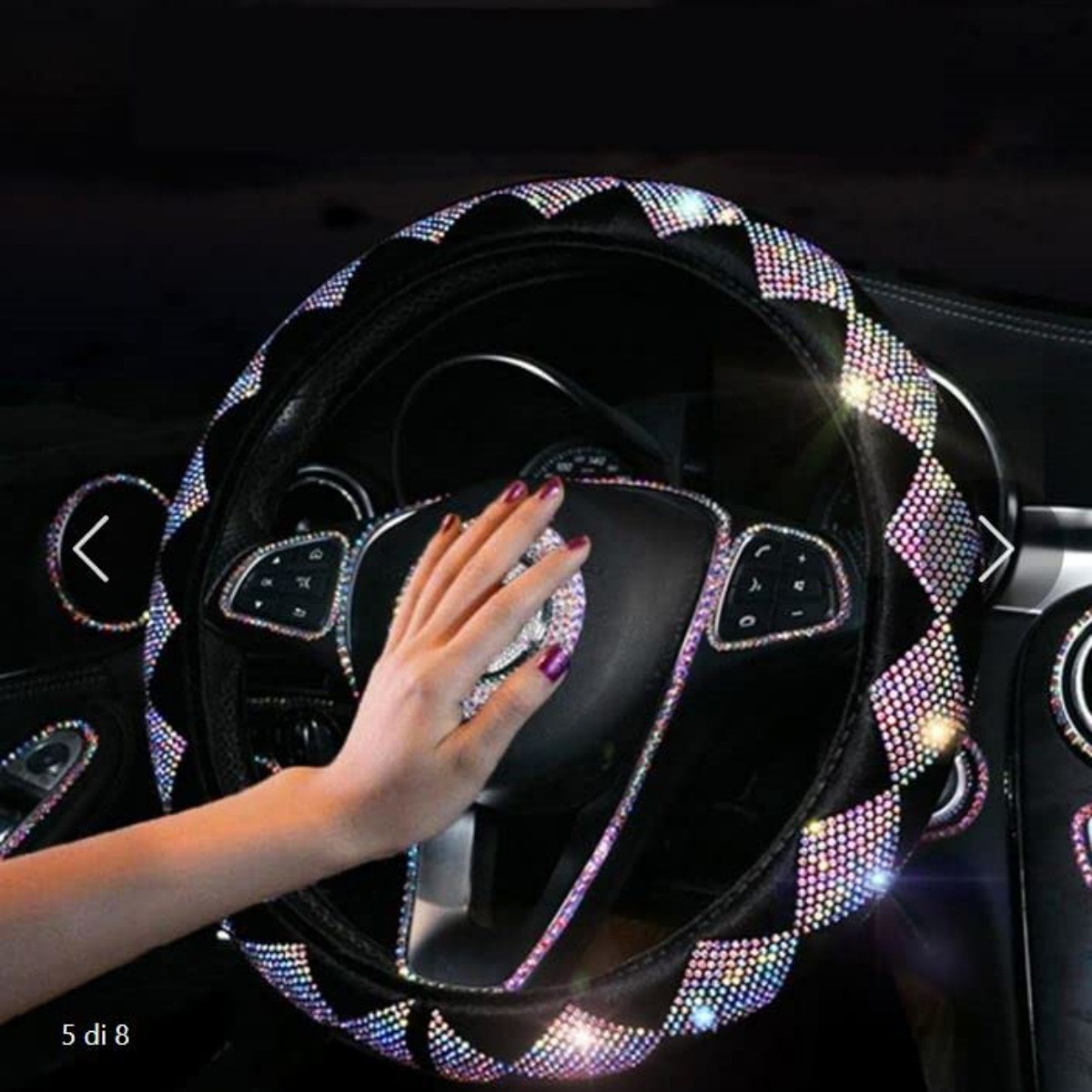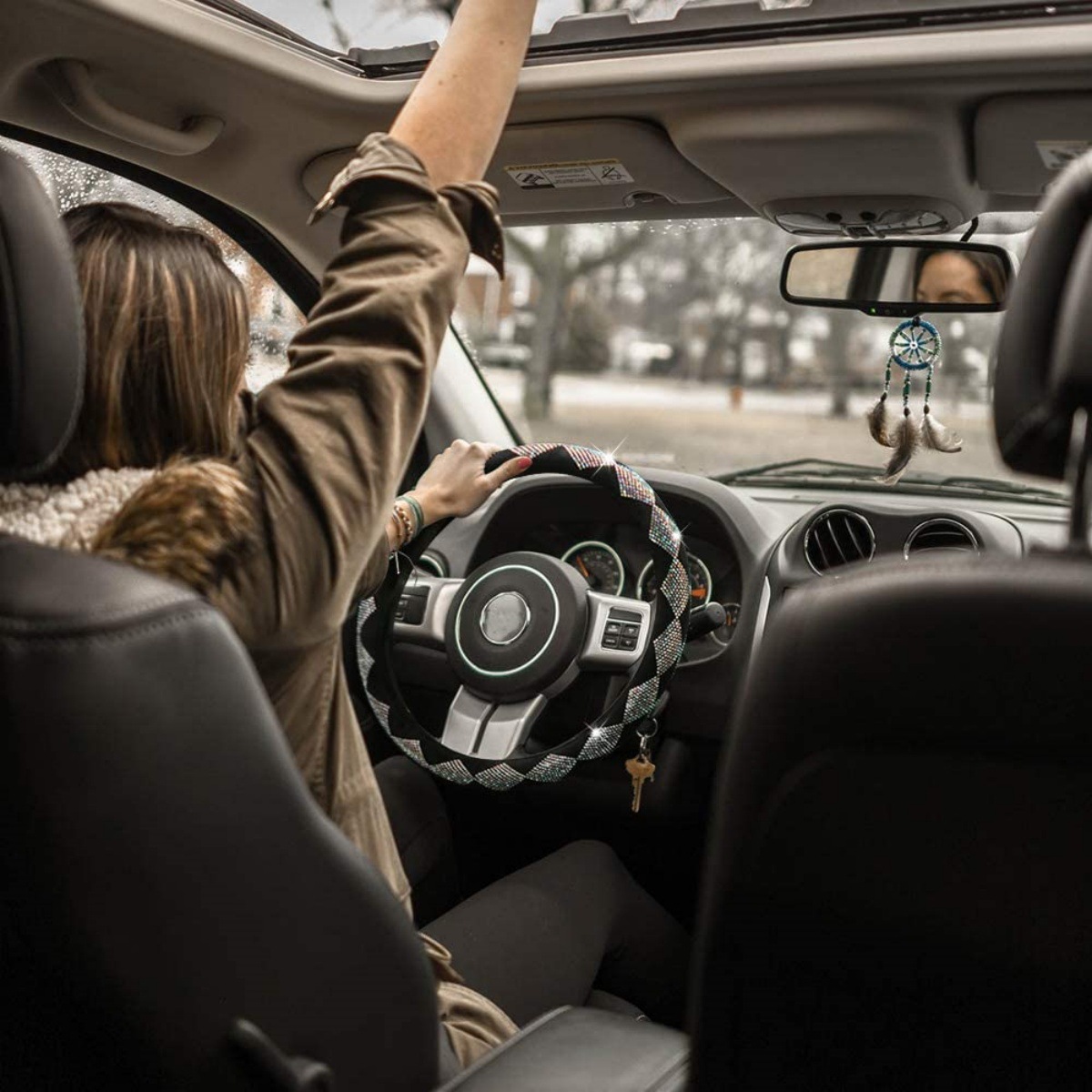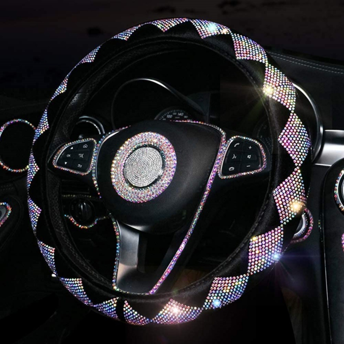 - Premium Material & Durability: Crafted with high-quality rhinestone studded material, this cover provides excellent grip, is wear-resistant, and ensures long-lasting durability, protecting your original steering wheel from daily wear and tear.