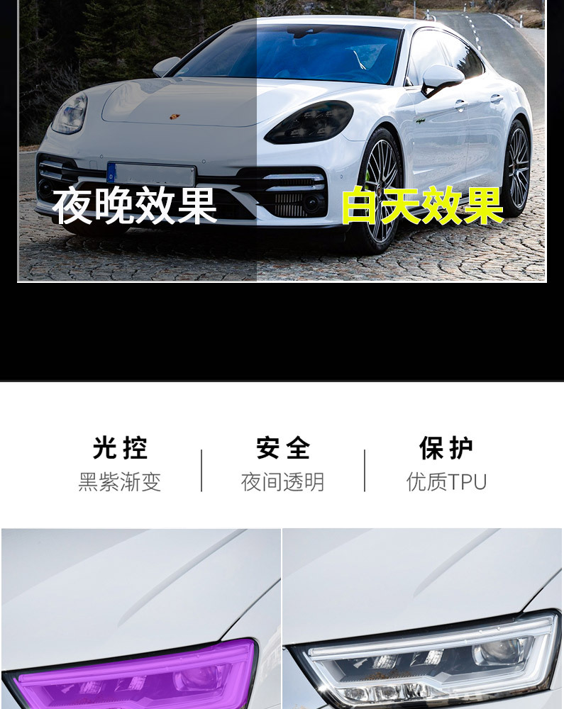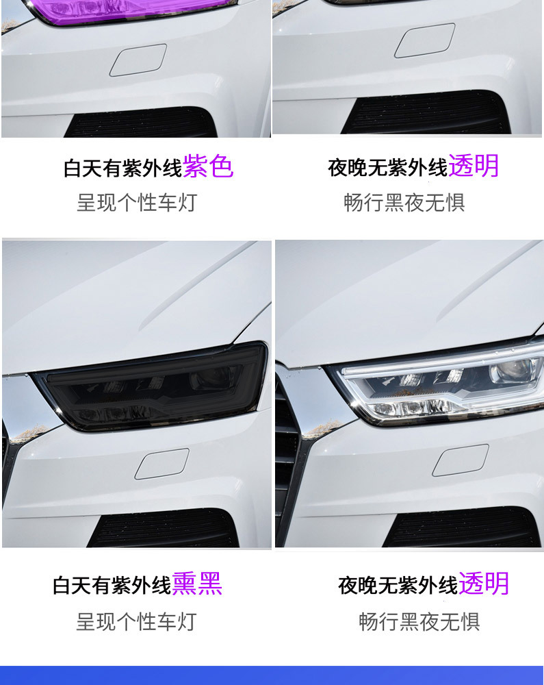 - Stylish Smoked Effect: Achieve a sleek, smoked look for your vehicle’s lights with our TPH film, available in color-changing options like white to purple or white to black, adding a customized and aggressive appearance.