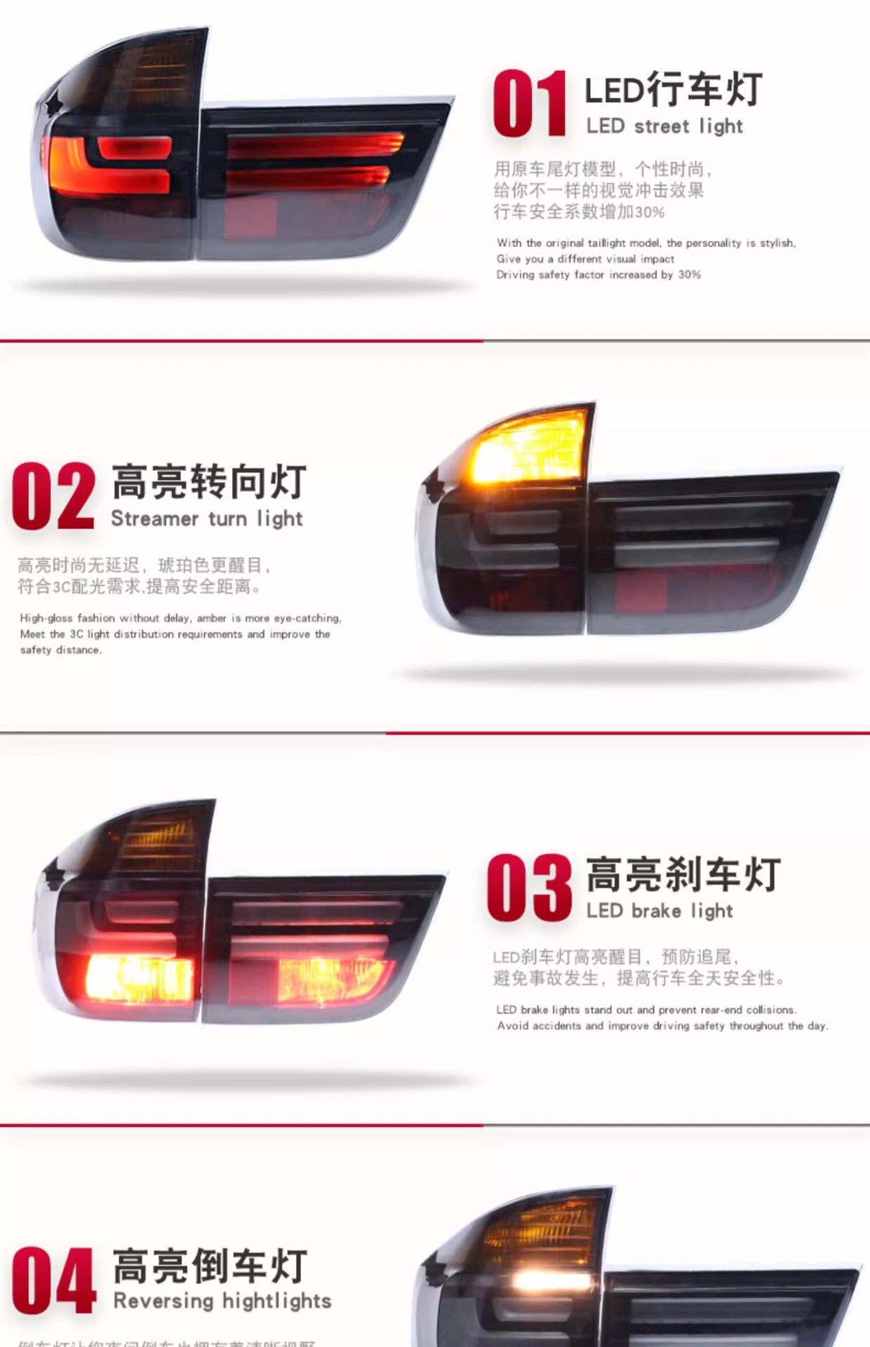 - Complete Tail Light Set: Includes a full set of LED tail light assemblies, offering a complete upgrade solution. Elevate your BMW X5’s appearance and functionality with this stylish and performance-driven lighting system.