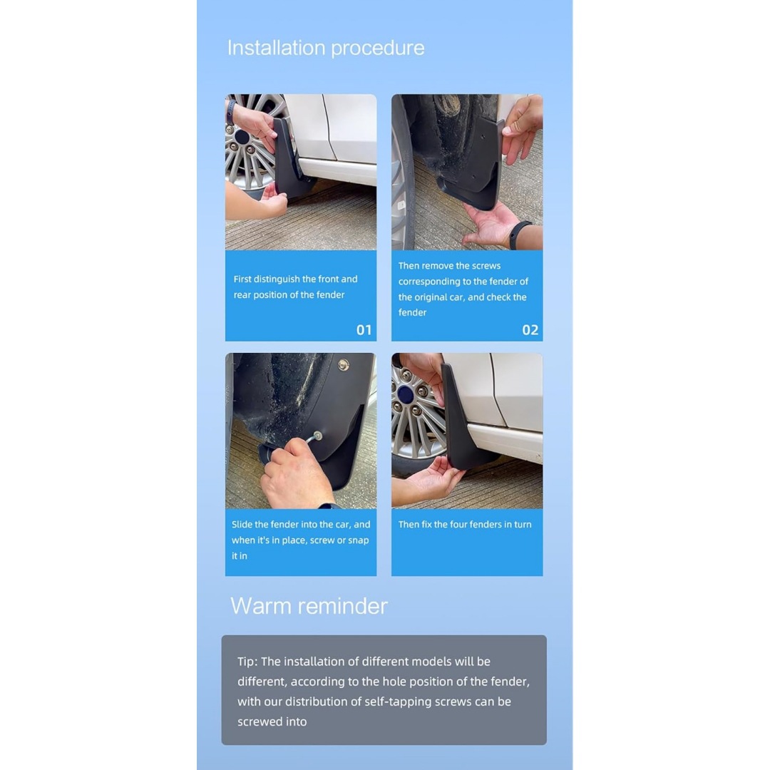 - Comprehensive Protection Kit: Each package includes a full set of mud flaps to cover all four wheels, effectively preventing splashes and minimizing paint damage. A must-have accessory for maintaining your car’s cleanliness and finish.