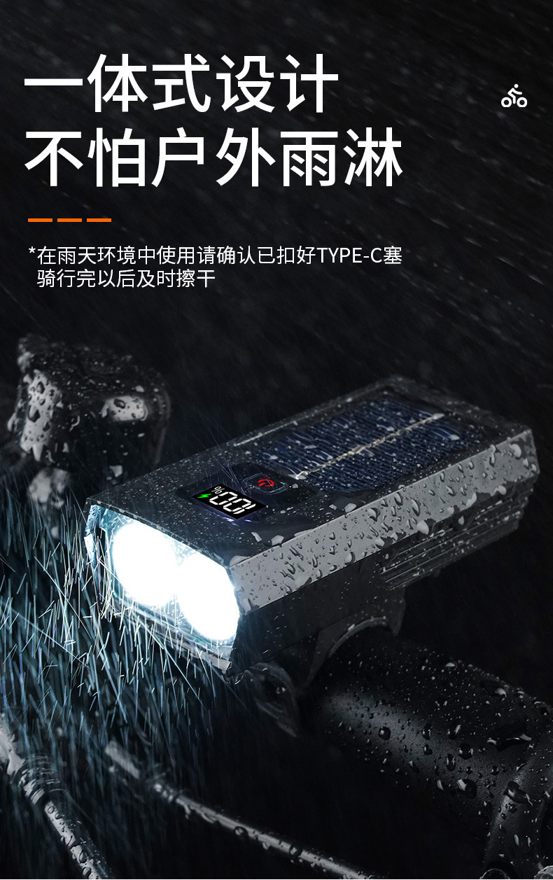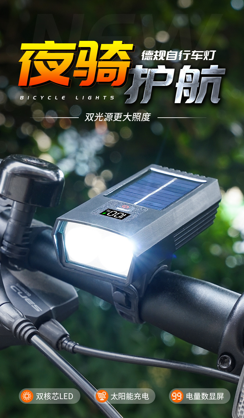 Solar Powered USB-C Rechargeable Bicycle Front Light with Digital Display for Mountain Road Bike