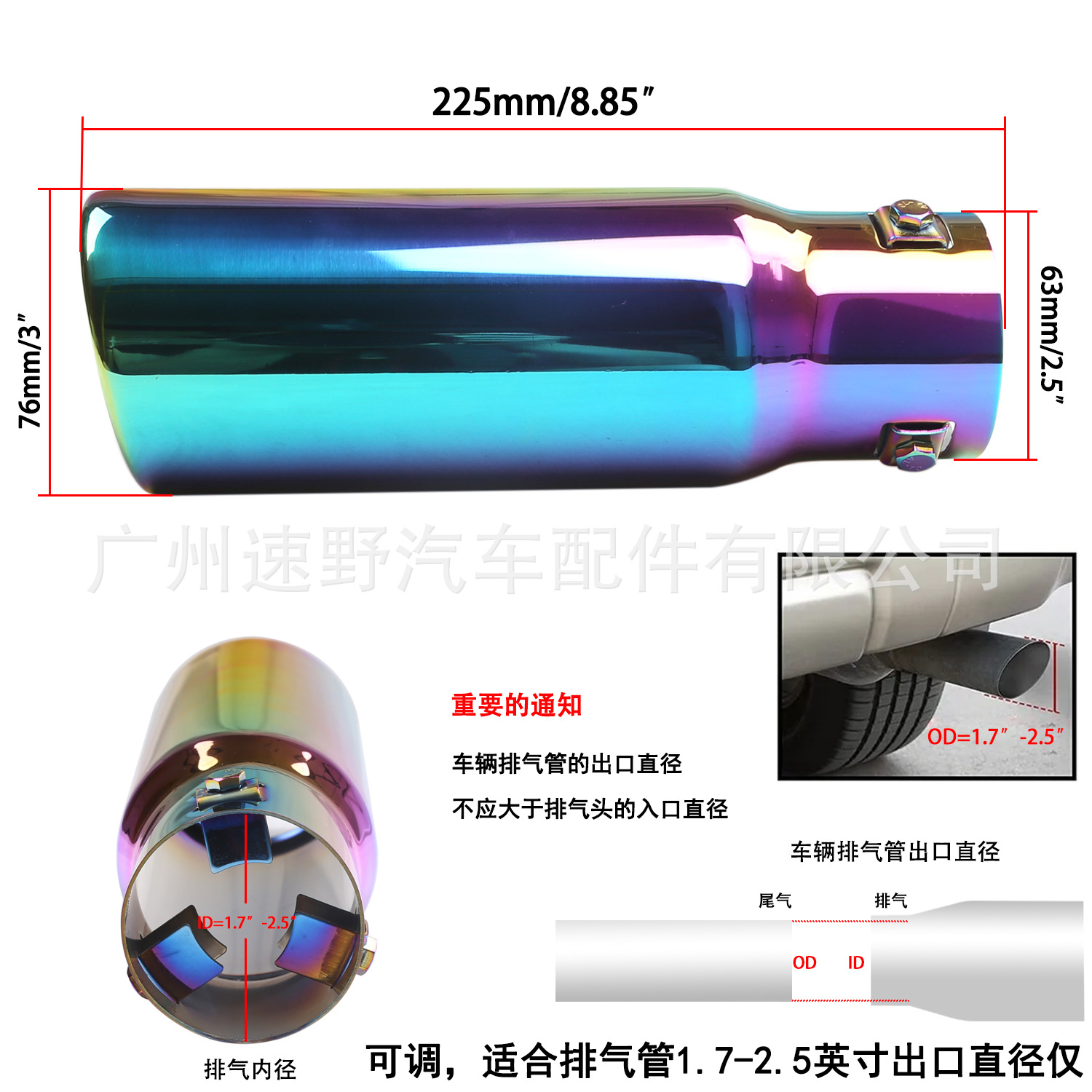 Stainless Steel Adjustable 8.5inch Length Exhaust Muffler Tip (63-76mm, 2.5inch Inlet) Single Layer