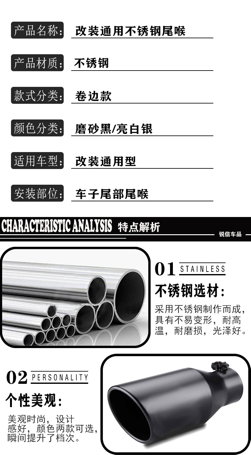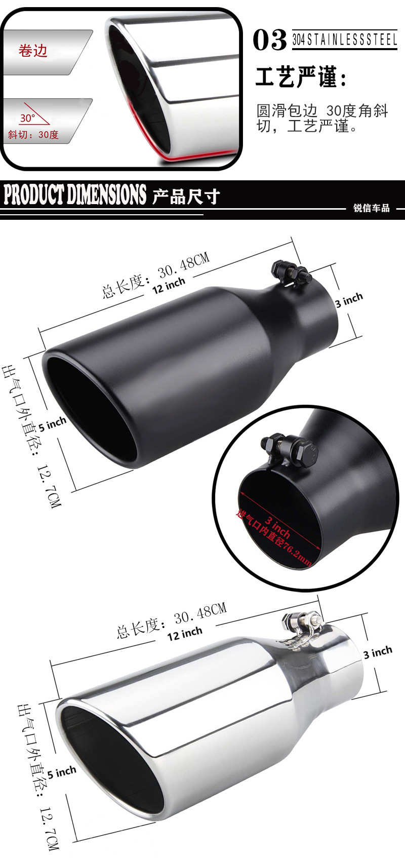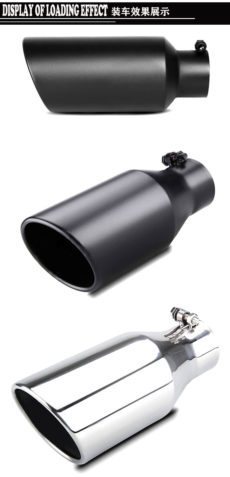 - Enhanced Aesthetic Appeal: Available in various specifications like 76.2-127*304.8mm matte black and bright silver, or 102-127-304.8mm silver and matte black, this exhaust tip adds a stylish and aggressive touch to your vehicle’s rear, improving its overall appearance.