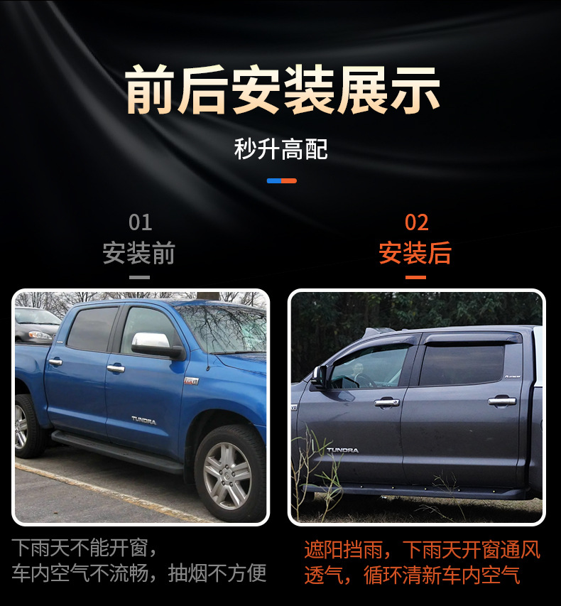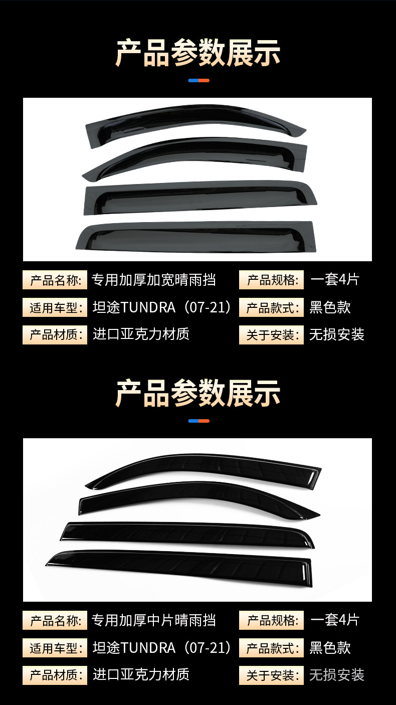 - Complete Package: Includes 1x roof top light bar, a set of 4x window visors, and 1x front stone guard, exactly as pictured on the Toyota Tundra. Please verify fitment details before purchasing.