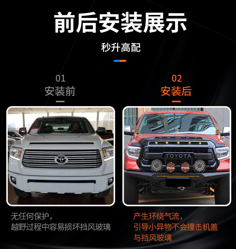 - Performance-Driven Design: Enhances both aesthetics and functionality, providing improved visibility with powerful LED lighting, protecting windows from rain, and guarding the front end from road debris. Improves driving safety and comfort.
