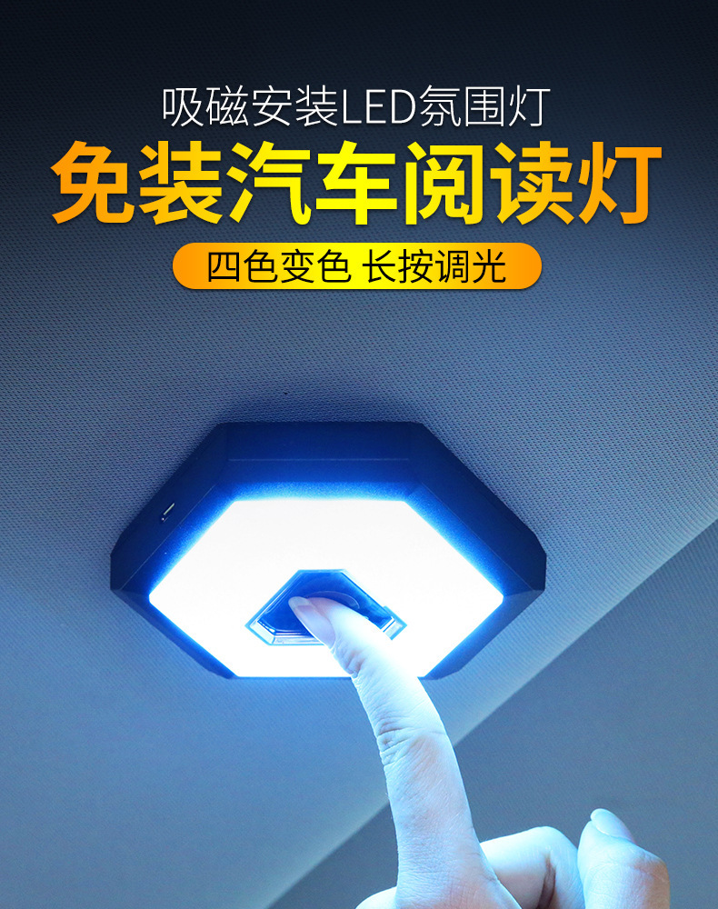 USB Rechargeable Car LED Reading Light Dimmable 3-Color 4-Mode Hexagonal Magnetic Mount for Universal Cars