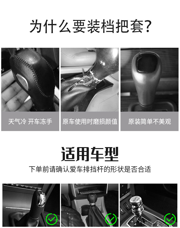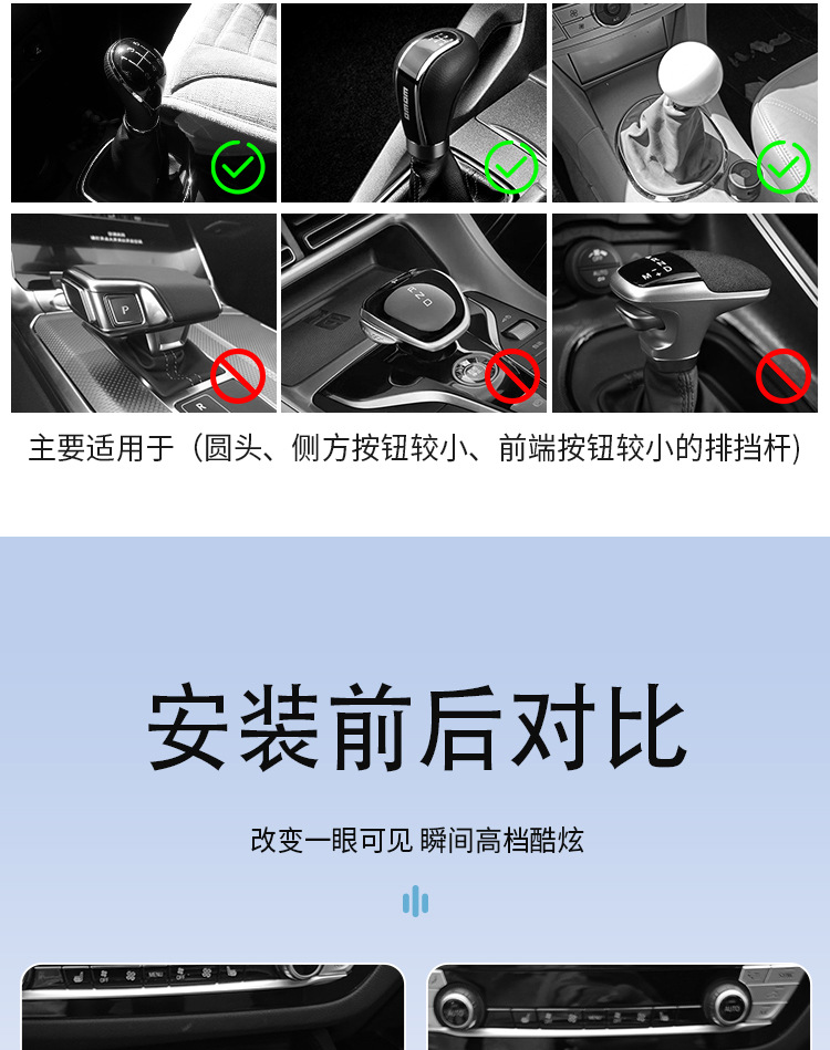 - Direct Fitment: A universal design suitable for most car gear shift knobs. Easily fits over various shift lever shapes and sizes as shown in images.