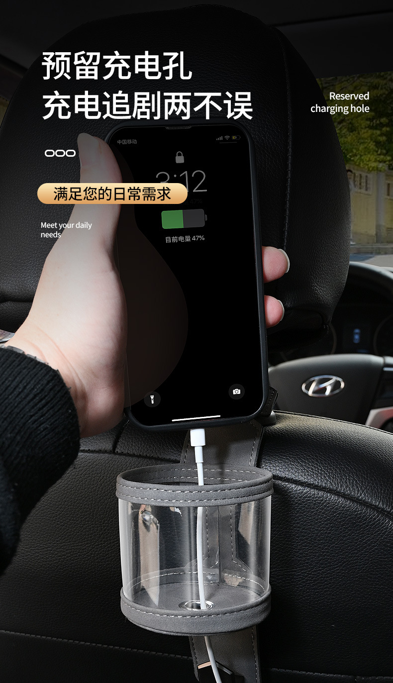 Universal Car Seat Back Headrest Hooks Hanger with Cup Holder & Charging Hole for Car Organization