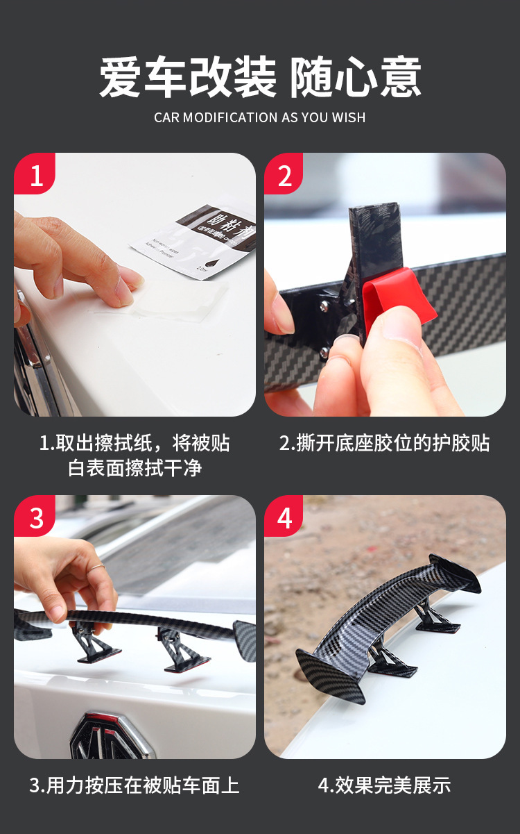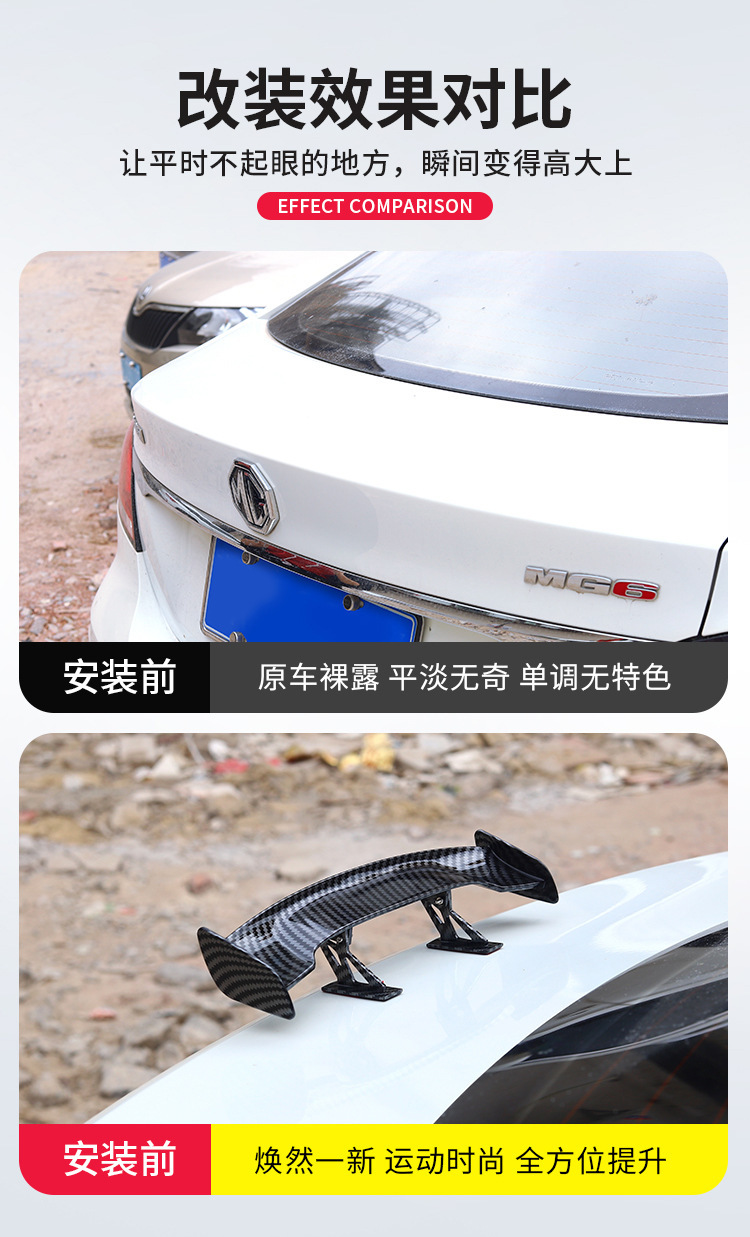 - Sporty Carbon Fiber Look: Featuring a stylish carbon fiber texture, or available in glossy black, electroplated silver, white, or red, this spoiler enhances your vehicle’s sporty appearance and personalization, making it stand out on the road.
