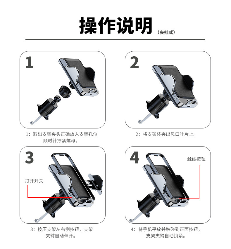 - Stable & Secure Mount: Equipped with a clip-on installation method, it securely attaches to the air vent, providing a stable grip for your phone even on bumpy roads.