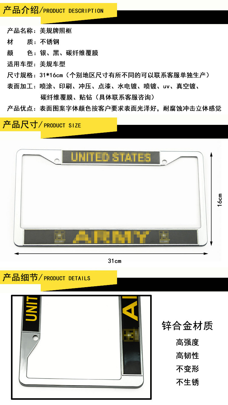 Zinc Alloy License Plate Frame Bracket Holder for US Vehicles